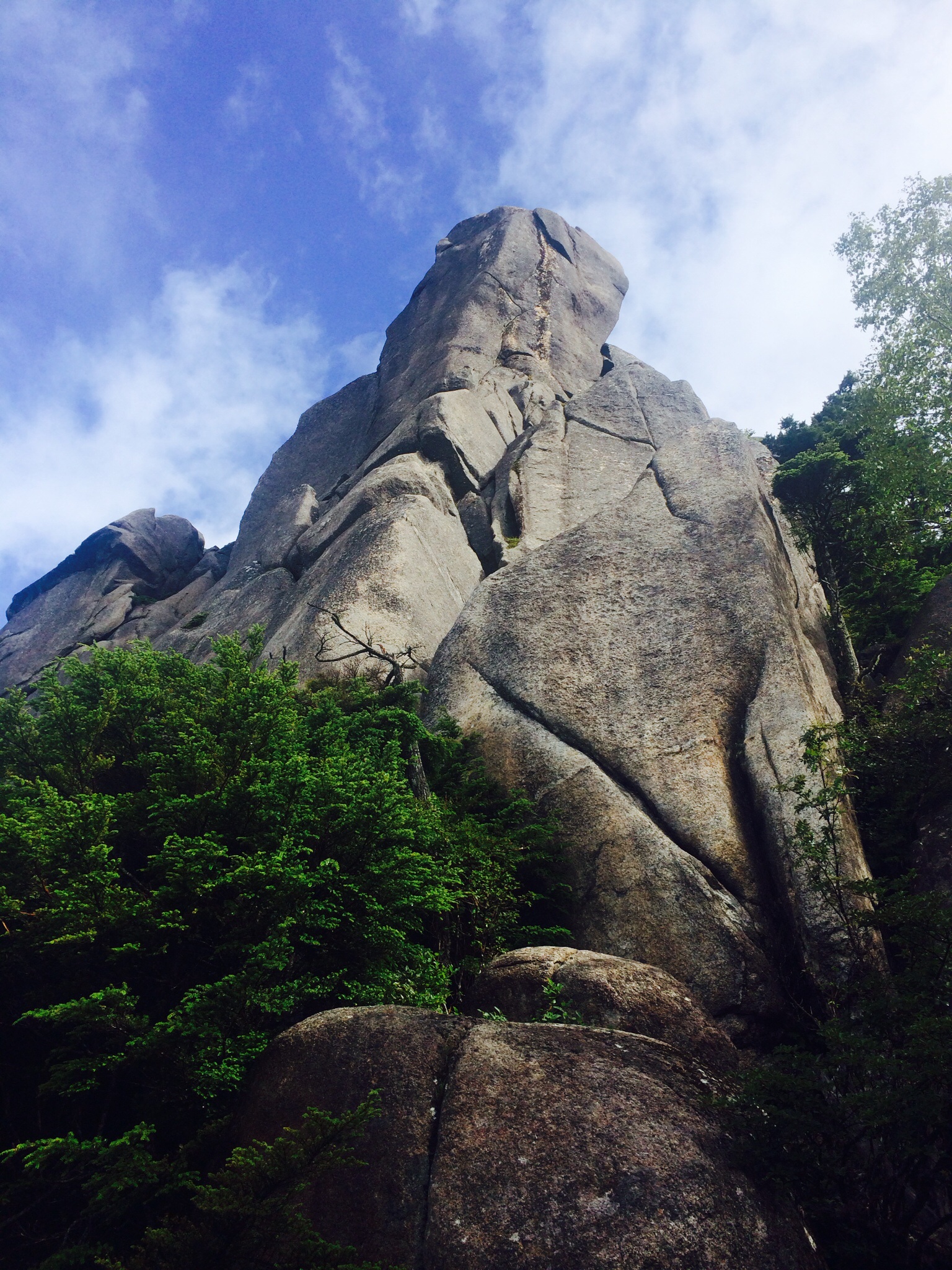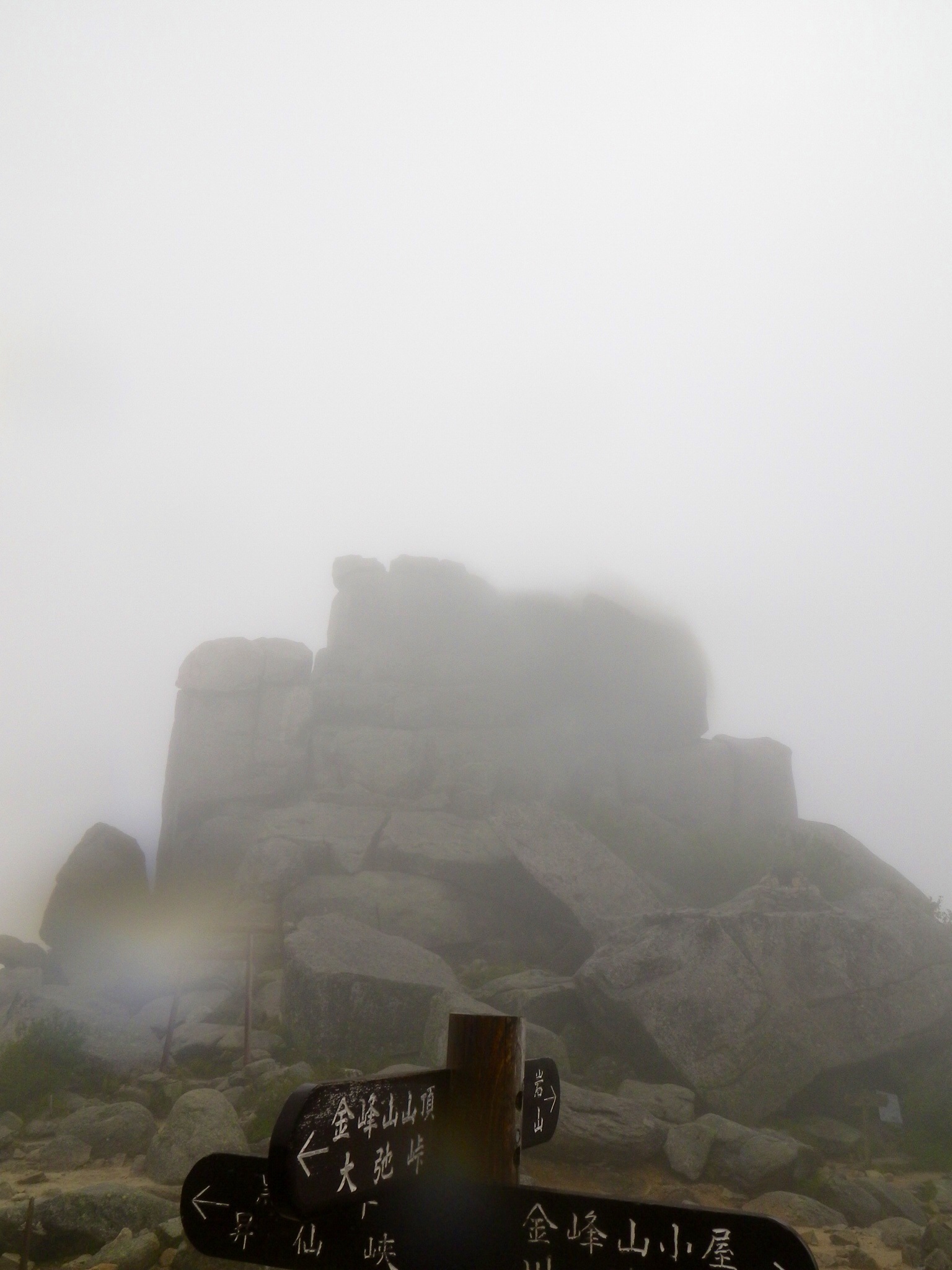金峰山(2,595m)に向けて高度を上げると、森林限界を超えてハイマツ帯となる。雨の森は美しいが、雨の岩場はご容赦願いたいところ。写真は金峰山の西にある五丈石。しばらく岩稜区間が続き、プチ北アルプスを呈す。マーキングがあまりなく、冷静にルートを判断して進む必要あり。