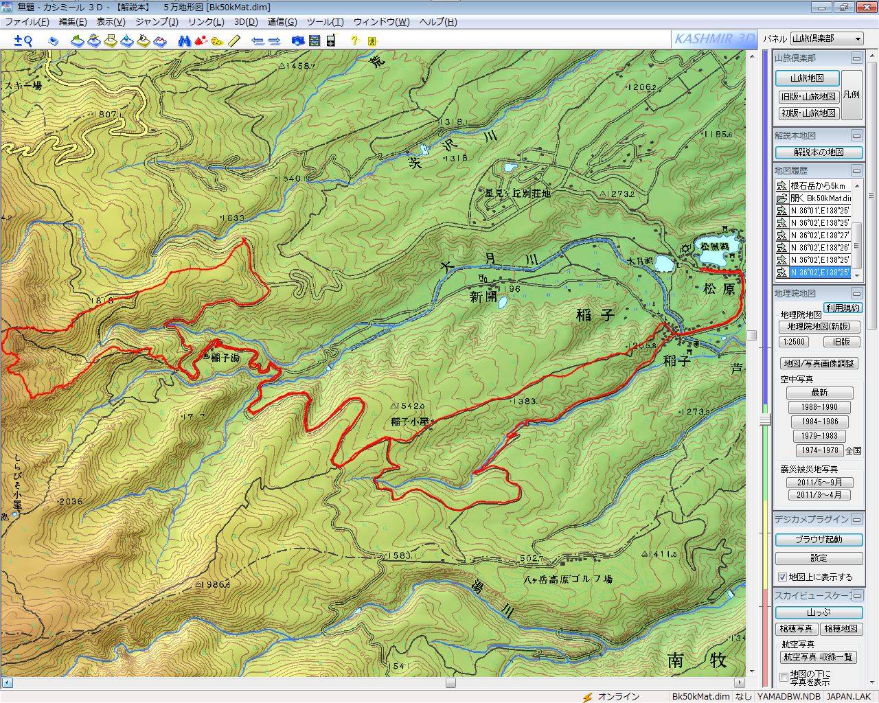 累積標高は1周1,667m ですから、8,335mとなります。カシミールは気圧式ではなく地図上の等高線データですので細かい高低はトレースしません。SUNTO AMBITだと9,000mを超えるかもしれませんね。