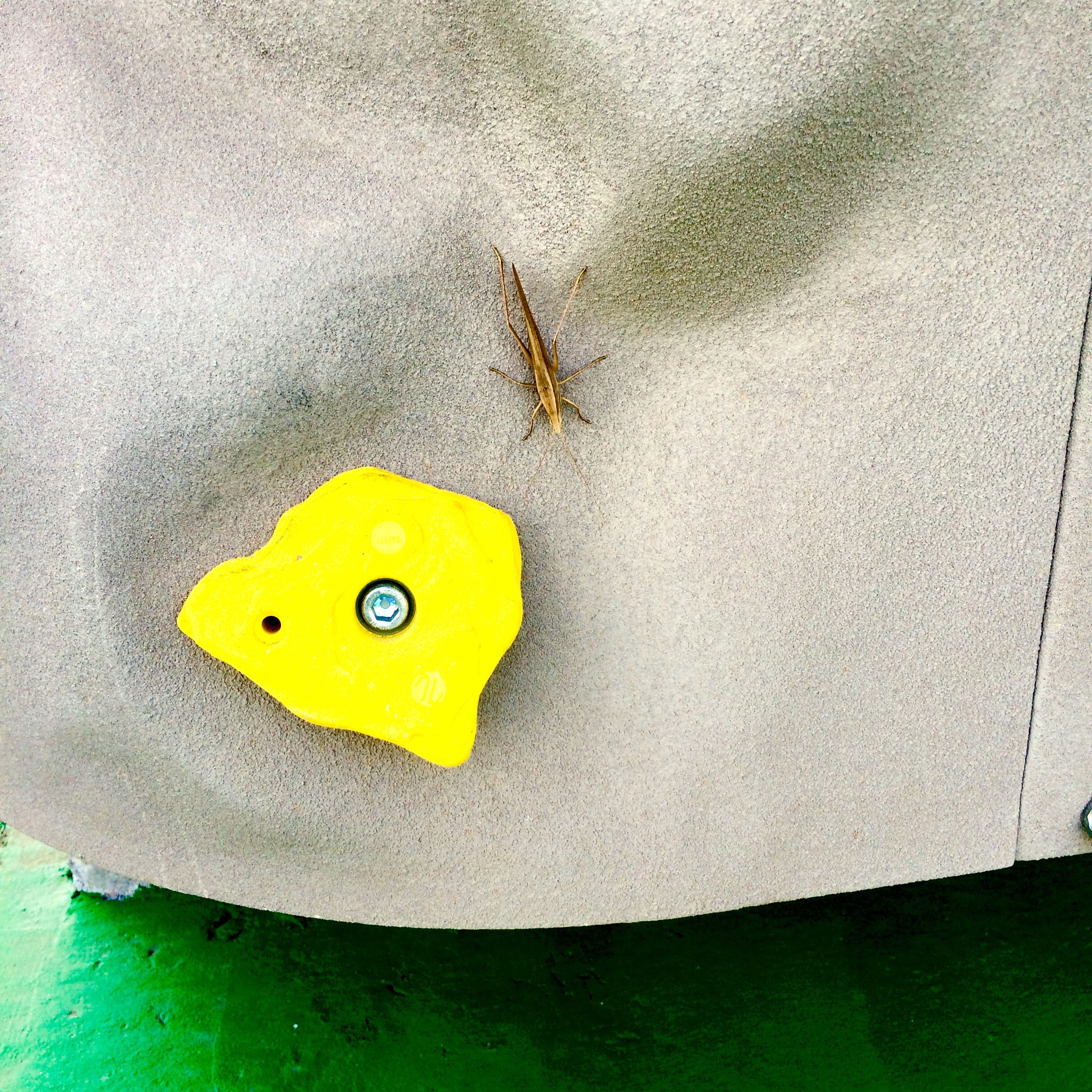 横に設置されている垂壁(90°)とスラブ壁(90°以下)は、擬似岩の形状をしており、途中に小さな棚があったり。表面はザラついていてフリクションもあり、スメア(摩擦を使ってホールド以外に足を置くこと)も十分に効く。5.7(初心者向け)の設定です。ウオームアップのつもりで登ったら、高さは同じですので結構疲れました(笑)