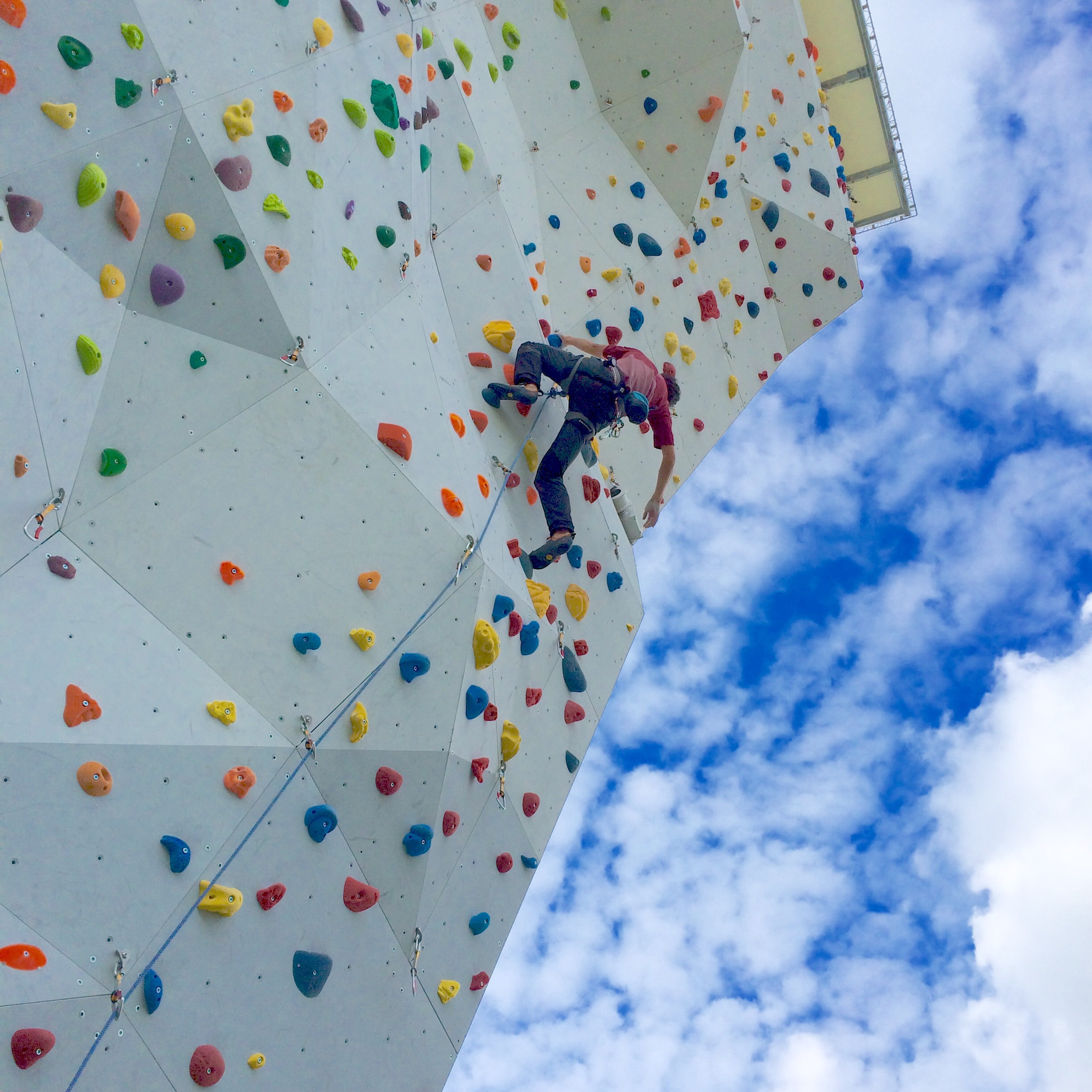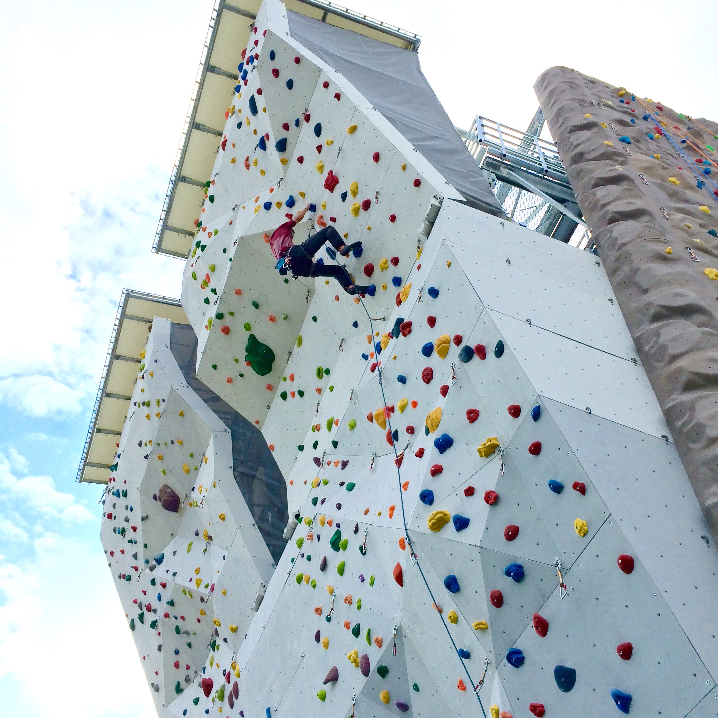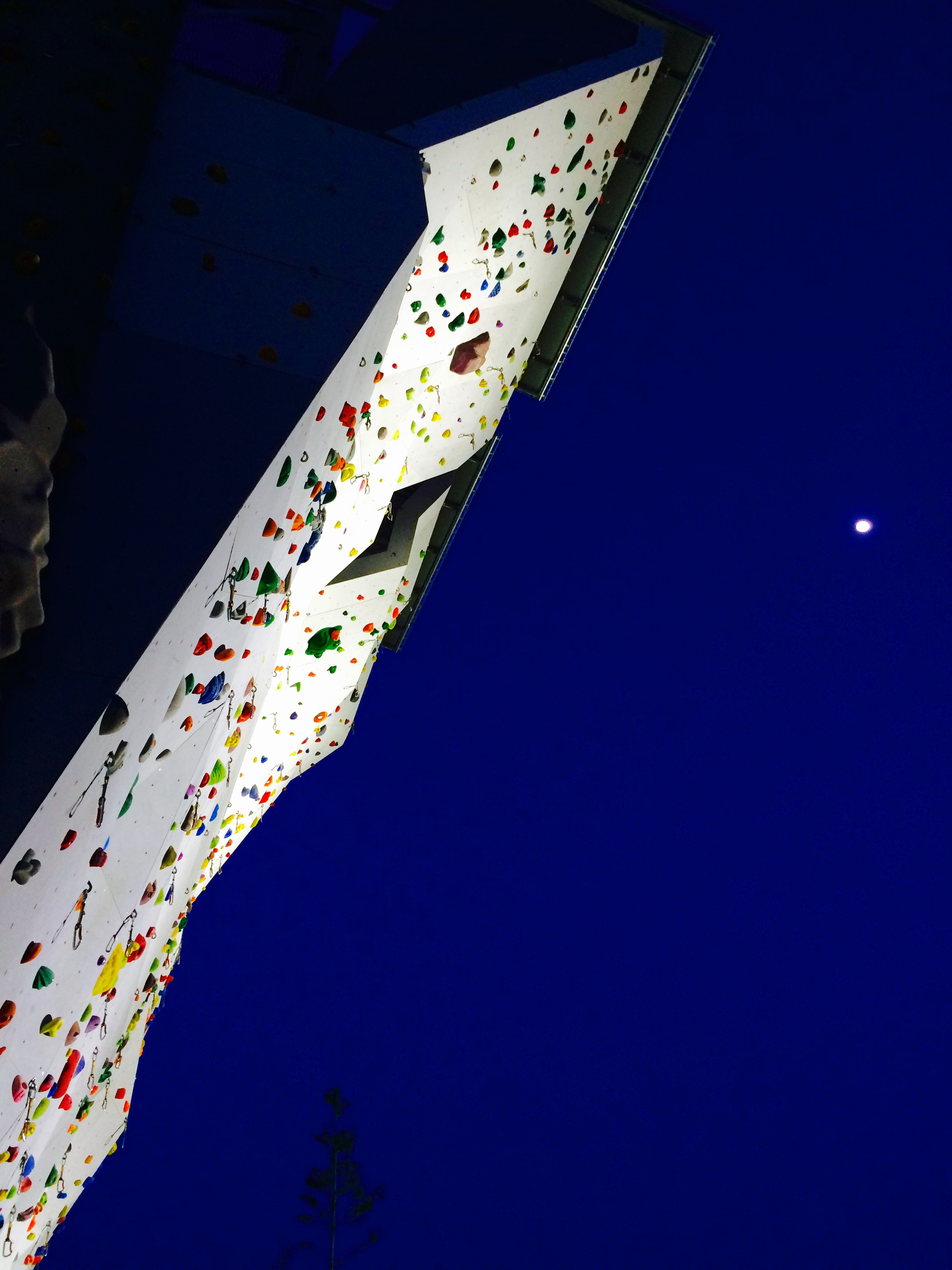 昼間は陽があたり、かなり暑く感じた。真夏はヌメってしまい、ハイグレードは難しくなると思う。夜間にナイターもあるのでそれを活用するのもよいと思います。ライトを浴びて、買い物客やテラスでコーヒーを飲んでいる人の視線やカメラを見ながら登るのはワールドカップクライマー気分です。
