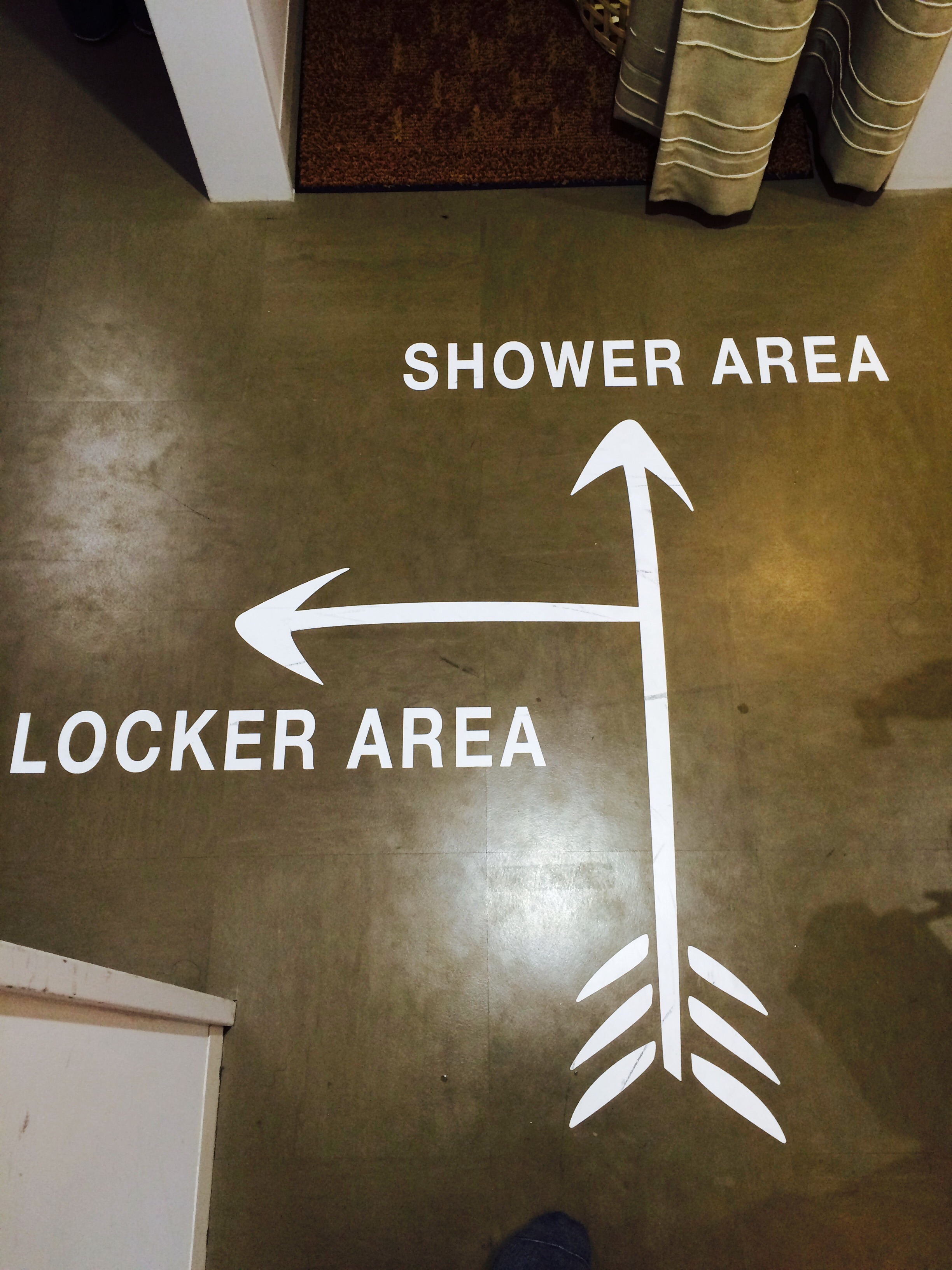 オブザベーション(登るルート、手順の確認)をしていると、高すぎて首が痛くなる。写真中央に写っているのがファーストクリップで、3.5mの高さにある(他のジムは2mぐらいのところが多い? ) つまり、上部でフォールした時にビレイヤーが壁に向かって持ち上げられて振られることがある。通常のジムよりも一歩前に出て、壁から離れないでビレイするように指導を受けた。