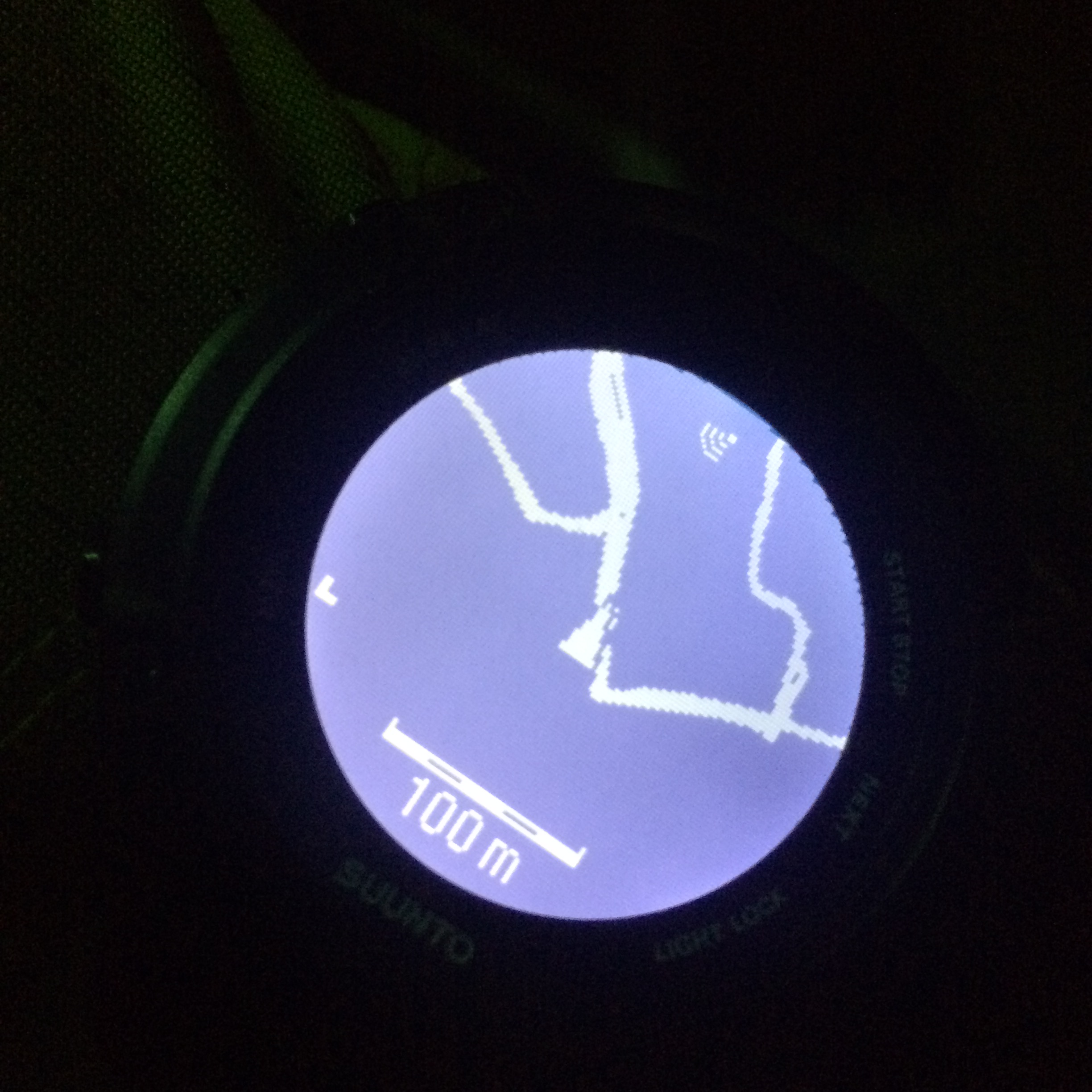 瑞牆山のピークからゴールまでの地図読み区間を含む20数キロで使用しました。 Ambit3のナビ機能で20キロ以上のルートを設定すると、時計画面に現れるルートの縮尺が大きくなり、小さなカーブは表現されませんので、ルート方向を示す機能があてにできません。また、先行者が迷ったと思われる踏み跡に入ってしまい、気づいて戻るということが何度かありましたが、このときも時計画面上ではほぼオンルートでした。やはり、ナイトナビゲーションといえども、地形図をみて、ライトで見える範囲であっても、尾根がどの方向に走っているのかを確認すれば、不安なく薮に分け入って進んでいく事が可能であることを学びました。今回の一番の収穫かもしれません。Ambit3のナビ機能は、分岐や、見落としやすい水場などをセットして、警告音を鳴らすことで、夜間のナビの補助機能として有効かと思います。
