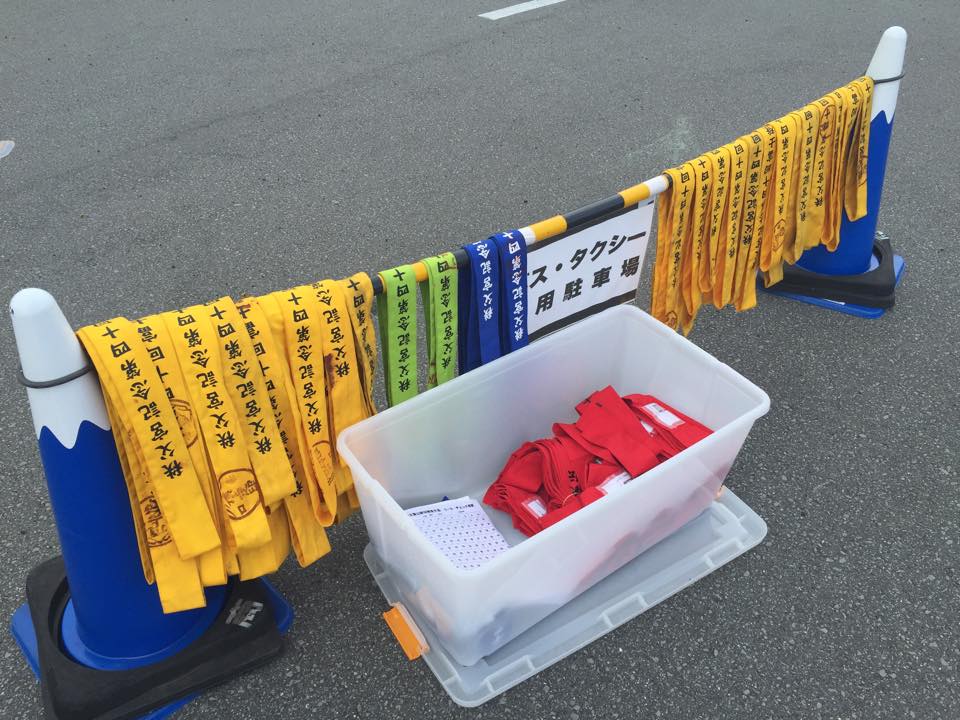 黄色が太郎坊関門に間に合わず、回収された襷。山頂の朱印に混じって、転倒時の血がついているものもある。赤が復路太郎坊から一斉スタートに使用される襷。残っているということは、使用されず、襷がつながったということ。その数が圧倒的に少ないのがわかる。