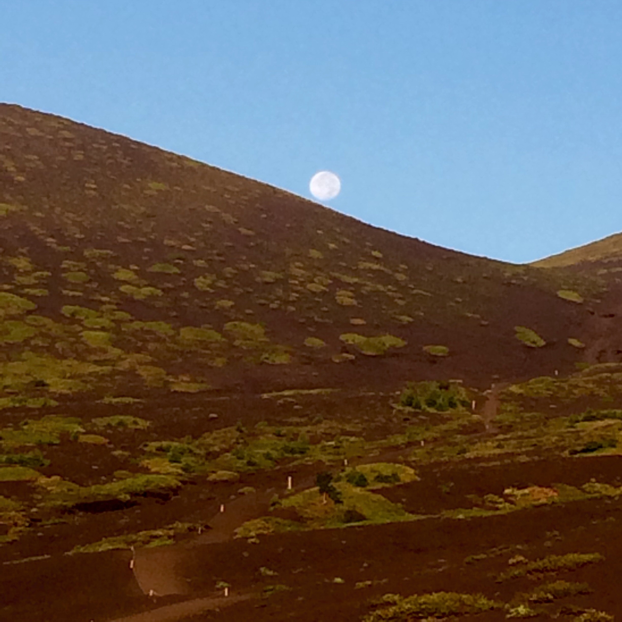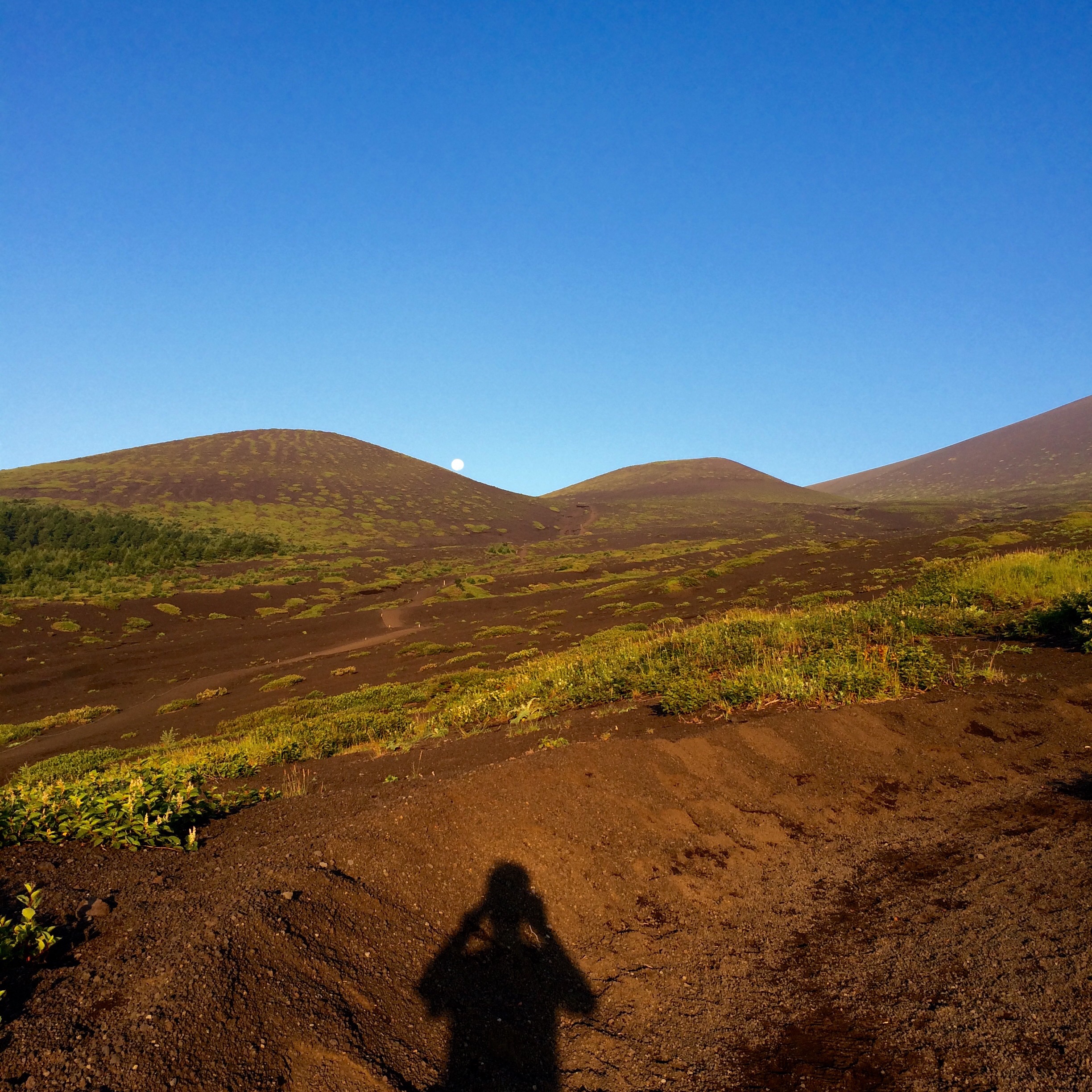 今年も富士登山駅伝のサポートに行ってきました。サポートとしての面白さや、やりがいみたいなものは去年のブログ(リンク)を読んでいただければわかります。当日朝、サポート場所へと、日の出とともに、御殿場口から登り始めると、砂礫の向こうに、双子山(双子塚とも呼ばれる)が見えました。第二回のUTMFでは、その脇の砂礫を下ってきたのを覚えている方も多いはず。そこへ、大きな月が沈もうとしているところ。数分前に日の出を見て、そして月の入りを見る。永遠と繰り返される、当たり前の営みであり、これが1日という単位であることを実感すると同時に、「明けない夜はない」という比喩の空気感みたいなものを感じることのできる時間でもある。
