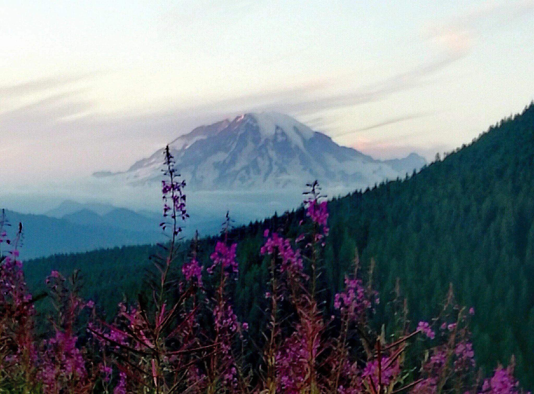 1つは本物の富士山ではない。アメリカ合衆国ワシントン州にあるレーニア山(4,392m)だ。シアトルへと移住した日系移民が、その昔、シアトルの港からもその裾野まで広がる雄大な姿に富士山を想い重ねたのだろう。当時の移民の方から「タコマフジ」と呼ばれていたそうだ。ネイティブアメリカンからはティー・スワークと呼ばれており、レーニア山からの改名運動もある。 下の写真はワシントン州の200マイルレース、Bigfoot200の後半、レーニア山が見えるトレイルからの風景だ。私自身はこのポイントを夜間に通過しており、自分のサポートクルーが撮影した1枚、夏の花々と万年雪をいただくレーニア山の対比が美しい。近くで見ると、富士山よりもぽっちゃり体型だ。私自身は夜明けとともに、180マイル地点から、もう少し遠目の美しいレーニアを見ることができた。(過去のブログへのリンク)