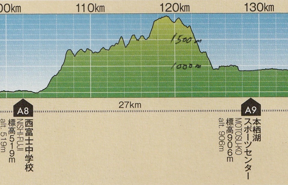 雨ヶ岳から端足峠へと下り、竜ヶ岳へ向かうには、そこから約200m(*わずか200mだが)登り返す。高低図にはこの200m upは表現されていなし、竜ヶ岳1,496mのピークも見当たらない。雨ヶ高から竜ヶ岳の最低高度地点は端足峠の約1,265mのはずだが、高低図では一旦、1,000mを下回り、その後は尾根をトレースするとは考えにくい高度一定の区間が数kmほど続く。これはピークを通過する尾根ではなく、コンタリング(高度維持)をしながら山の中腹、あるいは裾を巻いていくようなトレイルと考えるのが自然でしょう。つまり端足峠を竜ヶ岳へと向かわず、南方向へと一旦下ると標高1,000m前後を維持しながら本栖湖へと向かう東海自然歩道がある。高低図はこのルートを示していたのではないだろうか?計画はあったが、諸般の事情により、変更になったのではないだろうか? だが、このルートを通しても一旦1,000m以下に降下するポイントはない。ならばA沢貯水池近辺に一度下ろして、登り返しか?私の推測であり、本当の事は分からない。それでよいのです。それを受け入れるしかないのです。全ての情報が正しいという事はない。それを望むなら室内トラックを走ればよいのだから。(*マーク)をつけたように、わずか、というか、たかが200m upの話なのです。下位グループとはいえ、UTMFにエントリーするランナーなら20分もあれば登れるはずです。それなのになぜ、へたり込んで歩みを止めてしまったのか?そこには錯覚作用が働いていたのではないかと推測しています。