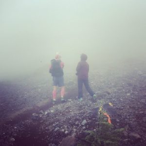 霧が濃くなった。樹林限界を超えた地点では、マーカーを地面に施したが、ランナーがすーっと地形に沿って谷へ向かわないか心配になり、Emmaちゃんとうさぎくんが待機していた。ここが一番気温が低いポイントだった。