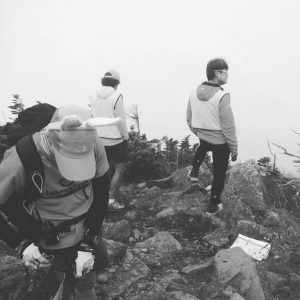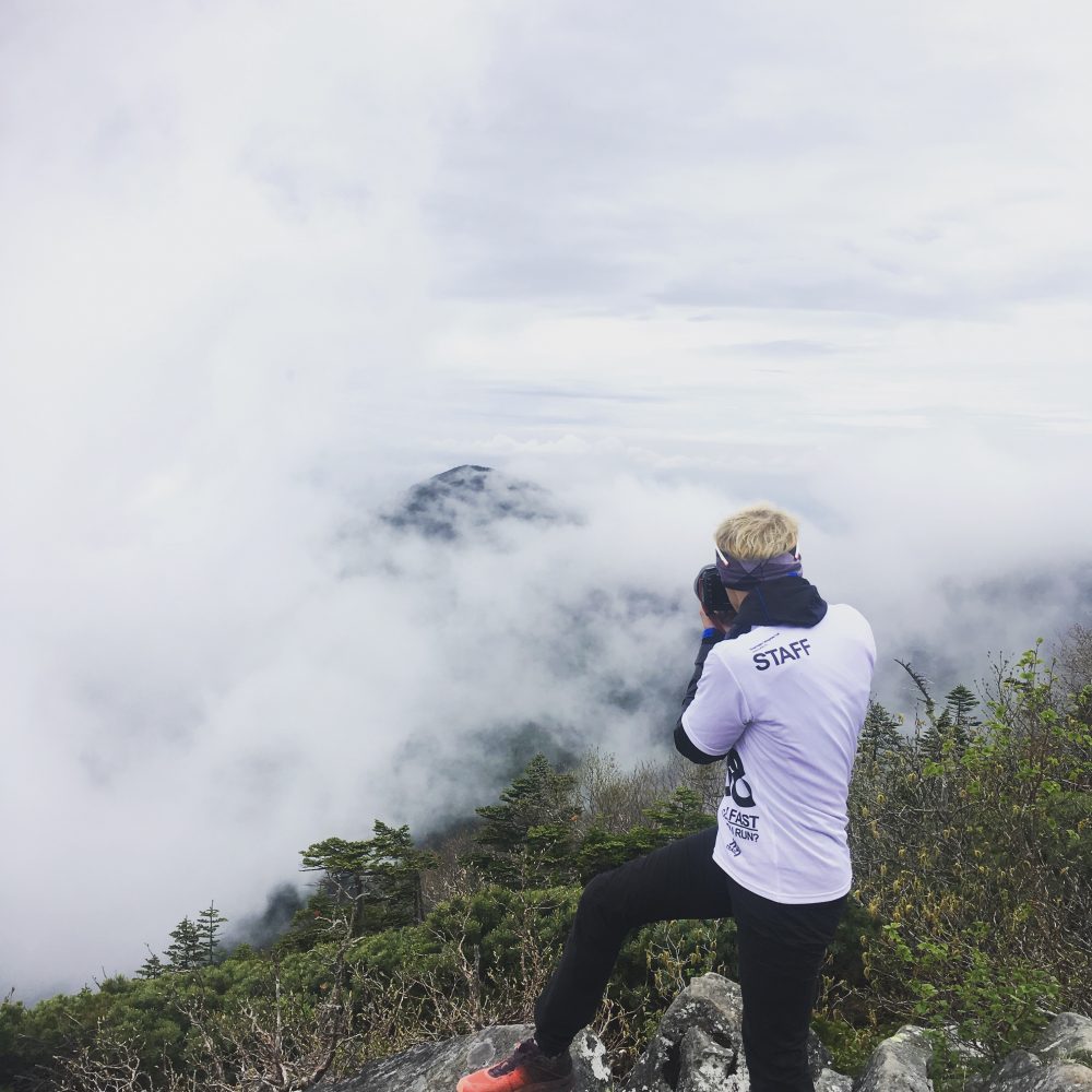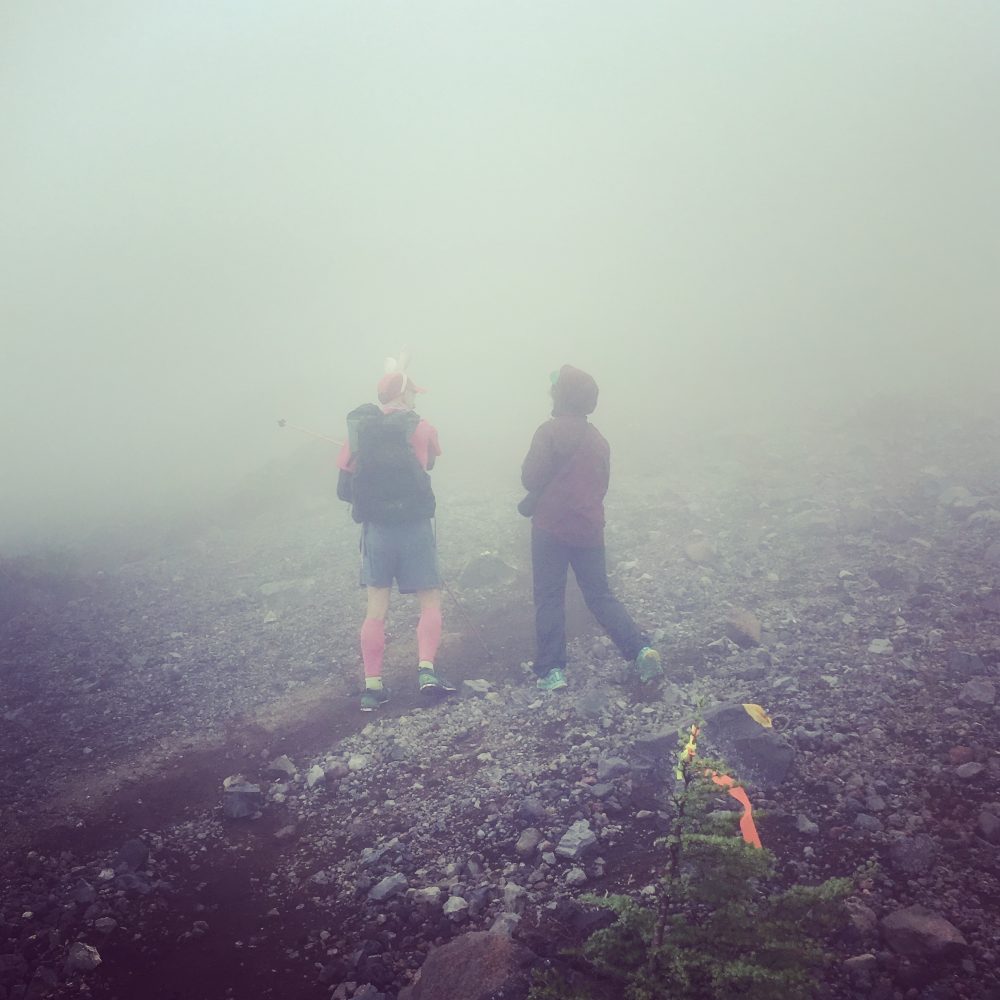 霧が濃くなった。樹林限界を超えた地点では、マーカーを地面に施したが、ランナーがすーっと地形に沿って谷へ向かわないか心配になり、Emmaちゃんとうさぎくんが待機していた。ここが一番気温が低いポイントだった。