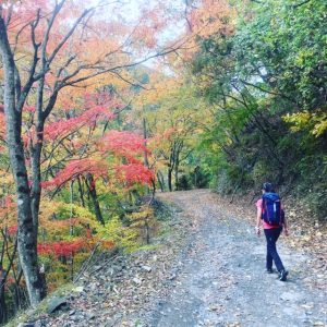 今回は最も短い後山(うしろやま)林道でのアプローチを選んだ。林道はトレイルランナーにとって退屈などとは言わず、紅葉に目を移すもよし、山地図には出ていない滝の名所を探して沢に降りてみるのもよし、走りやすいサーフェースを利用して心拍をあげるトレーニングをしてもよし、山の遊び方次第。