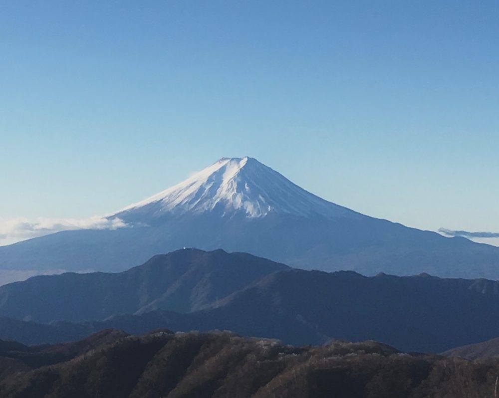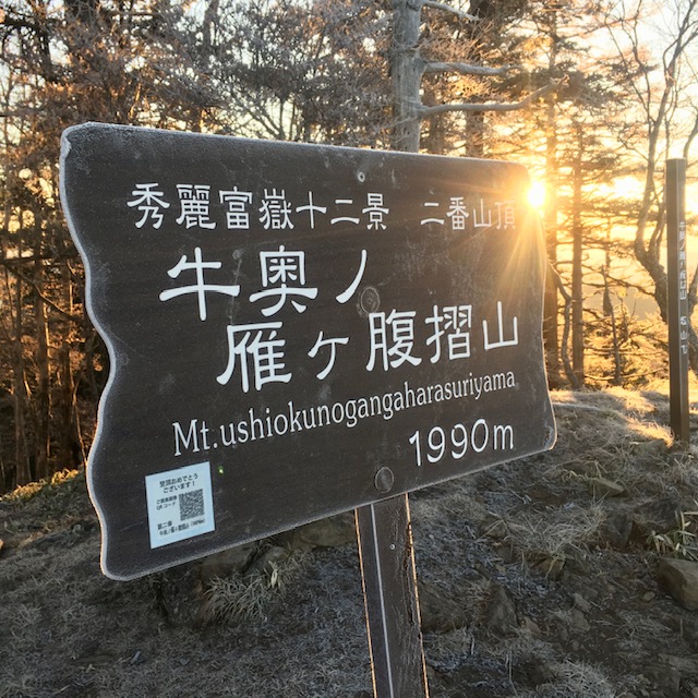 中盤-2 、絶景の富士山と気持ちの良い笹原、牛奥ノ雁ヶ腹摺山(うしおくのがんがはらすりやま)で、オートルートチャレンジのコースと分岐する。雁が腹をすりながら飛んでいくように見える意味が由来らしい。