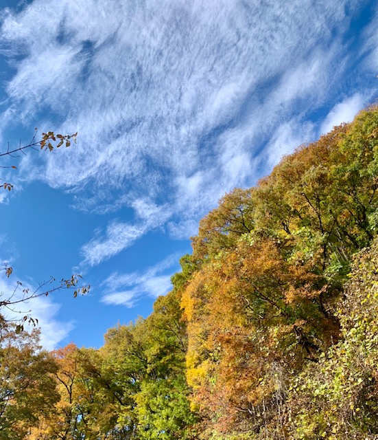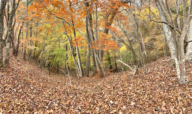 終盤-1、ここから、一旦沢まで降下、そして往路で使用した尾根まで登り返す。沢には水があり、美しい広葉樹林が広がる。熊さんが多いというのも納得できる。