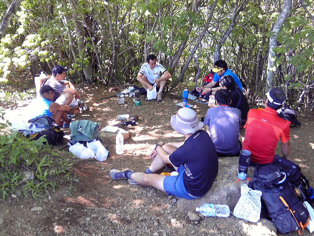 トレイルで大岳山山頂にくると、家族連れや山ボーイズ&ガールズがバナーを使って食事をしてます。何気に、うらやましかったんですがw、この日は男9人で塾長のDIYアルファ米と通常のアルファ米、レトルトカレーを分け合って食べました。