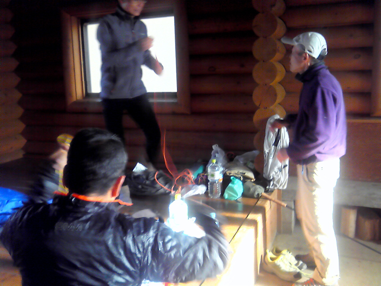 この日、座学で三頭山の非難小屋に入りましたが、昼間の木漏れ日に反して、かなり冷え込んで寒かったです。小屋の中なのに、シューズを脱いだ足やロープワークをする手もかじかみました。