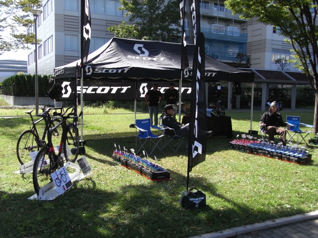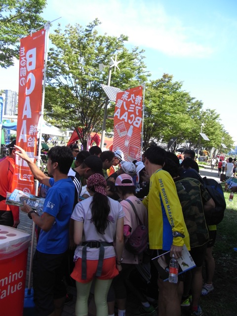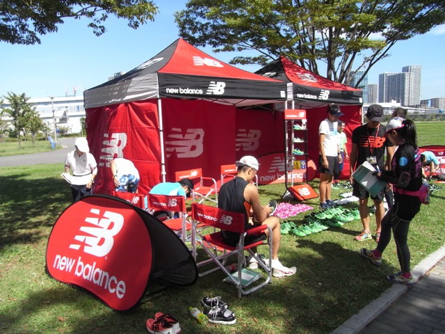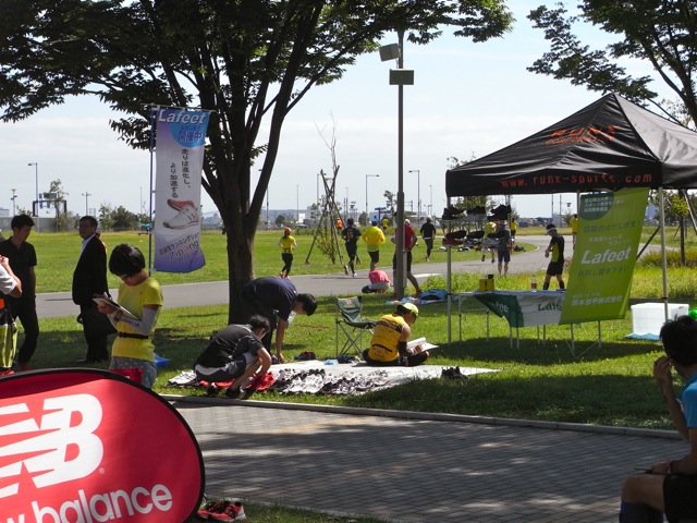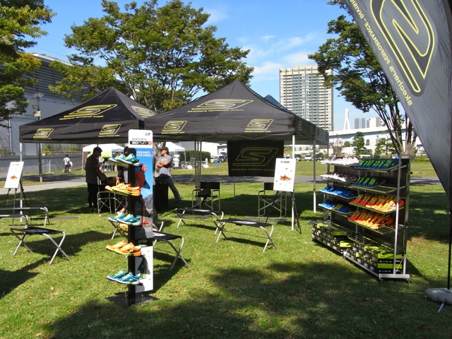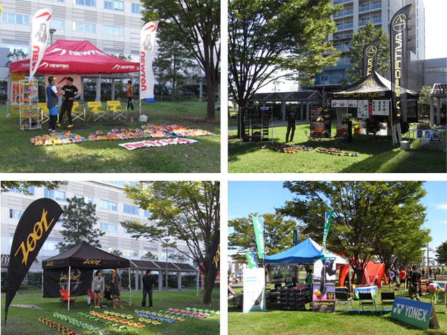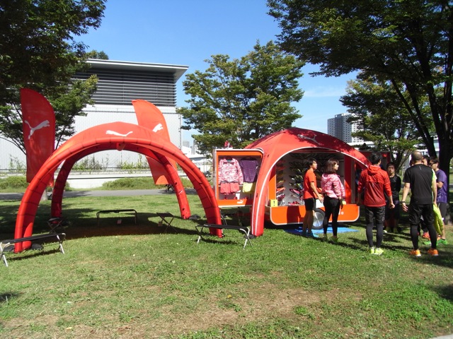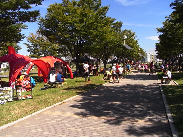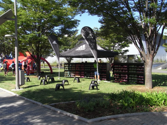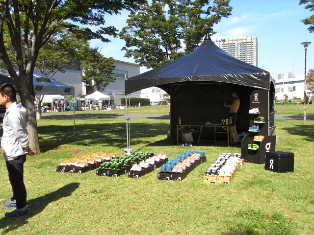 イベントは200名くらいのランナーが参加していたようです。公園に通じる道を挟んで両側にメーカーごとのブースが並んでいます。