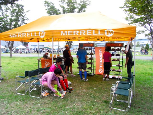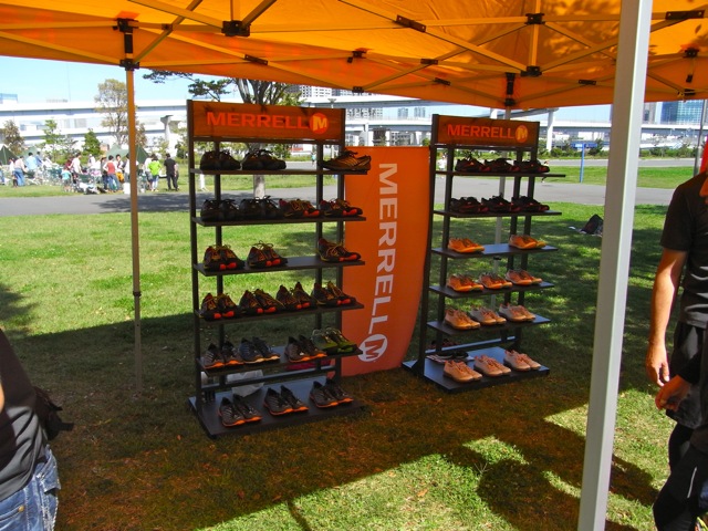 で、今回参加させていただいた経緯ですが、OSJ八ヶ岳の100マイルでお知り合いになったMERRELLの松崎様にイベントで試履きシューズを陳列する什器を製作させていただきました。そしてこのイベントで初めて使用するに当たって、什器の確認と合わせてトライアルに参加させていただきました。様々なブランドのシューズにトライアルできる貴重な機会。実に有意義なイベントです。以前から気になっていたMERRELLのベアフット系のシューズもトライアルさせていただきました。