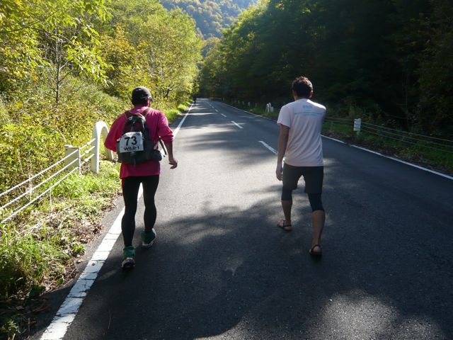 上りの途中で前半のトレイル部分で颯爽と抜かれたランナーと合流。話しながら歩を進めました。