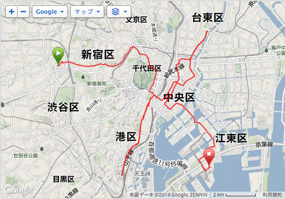 この先は信号も少なくなりビックサイトまで淡々と走りゴール。信号での止まっているのを除いて4時間20分くらい。車線横断などもあって本コースより距離が伸びて44kmになりました。いいトレーニングになりました。最後まで誘惑に負けずちゃんと走ってよかったです。