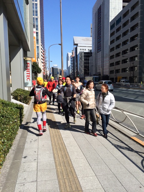 で私のグループは5人で比較的真面目に走ってました。品川折り返しまでは無補給で、日比谷から銀座の雑踏を抜け、浜町からの江戸通りで25km過ぎでみんなちょっと飽きてきてテンションが落ちていたところで、iPhoneを見るとFB上に“電車でワープ”“ビール飲んで楽しそう”な他の参加者の写真がアップされる。もう真面目に走るのやめようかという空気になり、浅草の神谷バーに5人で突入するも満席で玉砕。