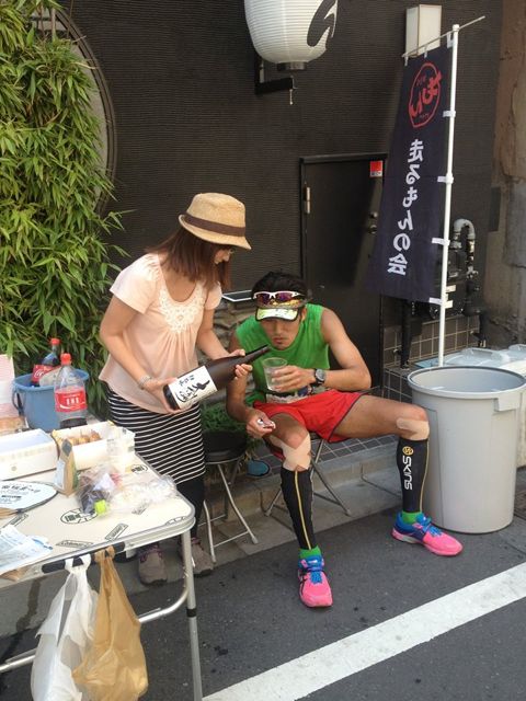 何とかスカイツリーのエイドまで・・・と朦朧としていたら押上に住む友人がSYU君が自転車で応援に駆けつけてくれました。