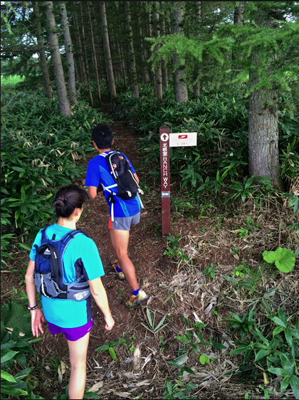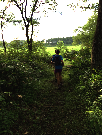 その後は舗装路に沿ったトレイルになります。道中は佐伯農場の佐伯さんが自信で草を苅って整備しているのですが、クマザサ(かな?)の切り口が少し尖っていてソールから突き上げがあります。(980はミッドソールが単一素材で厚みはあるのですがプレートなどは入っていないので、かなり突き上げ感がありました。)よってこのコースは0mmドロップの裸足系のシューズやルナサンダルなどではちょっと厳しいかと思います。