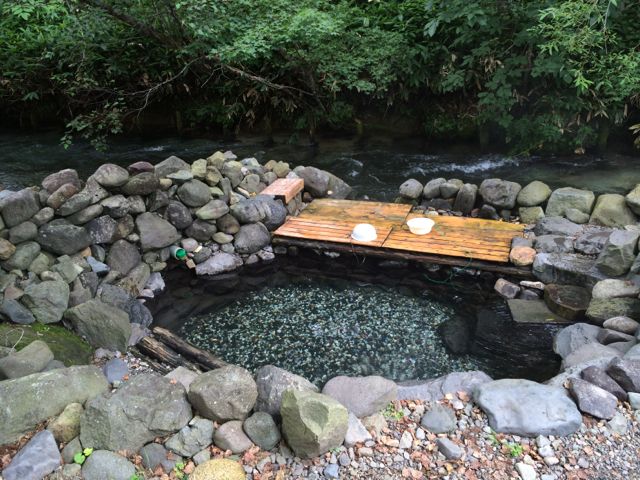 いきなり林道奥深くにある地元の人しか行かない川沿いの素晴らしい露天風呂「からまつの湯」にてメンズ3人でいきなり入湯。(Nomaさんすいません。)