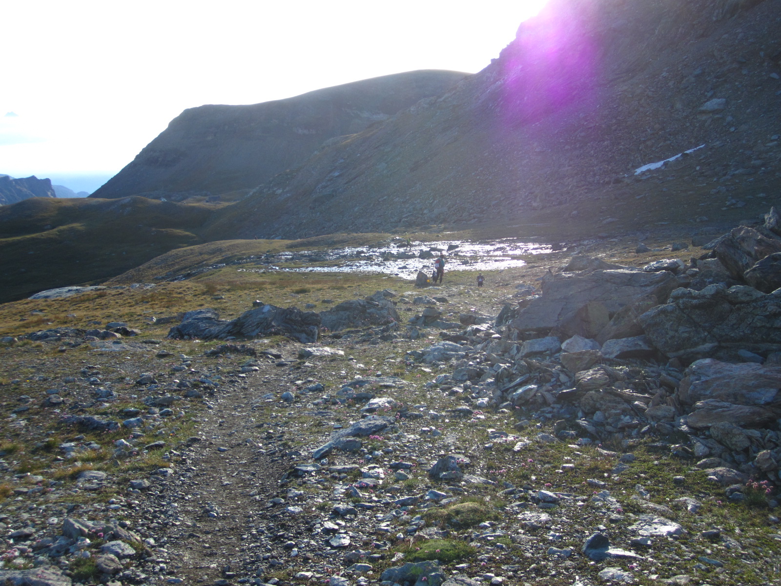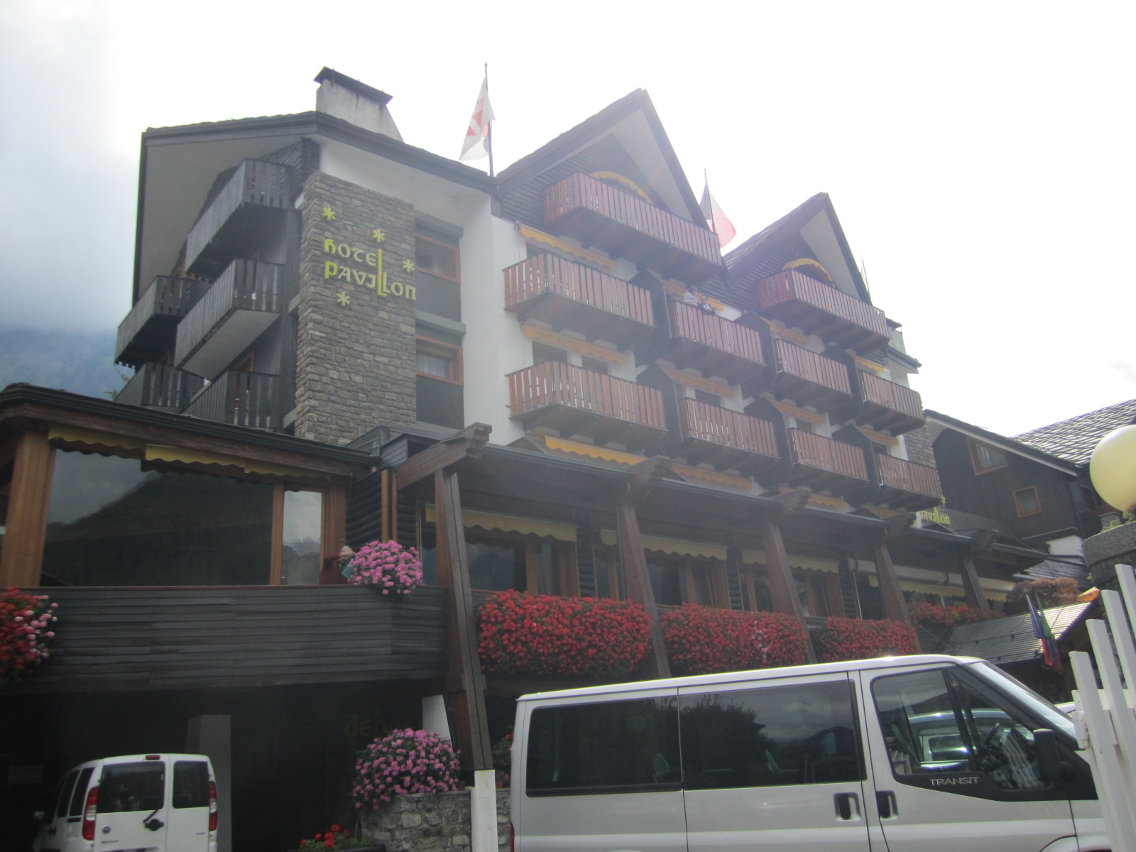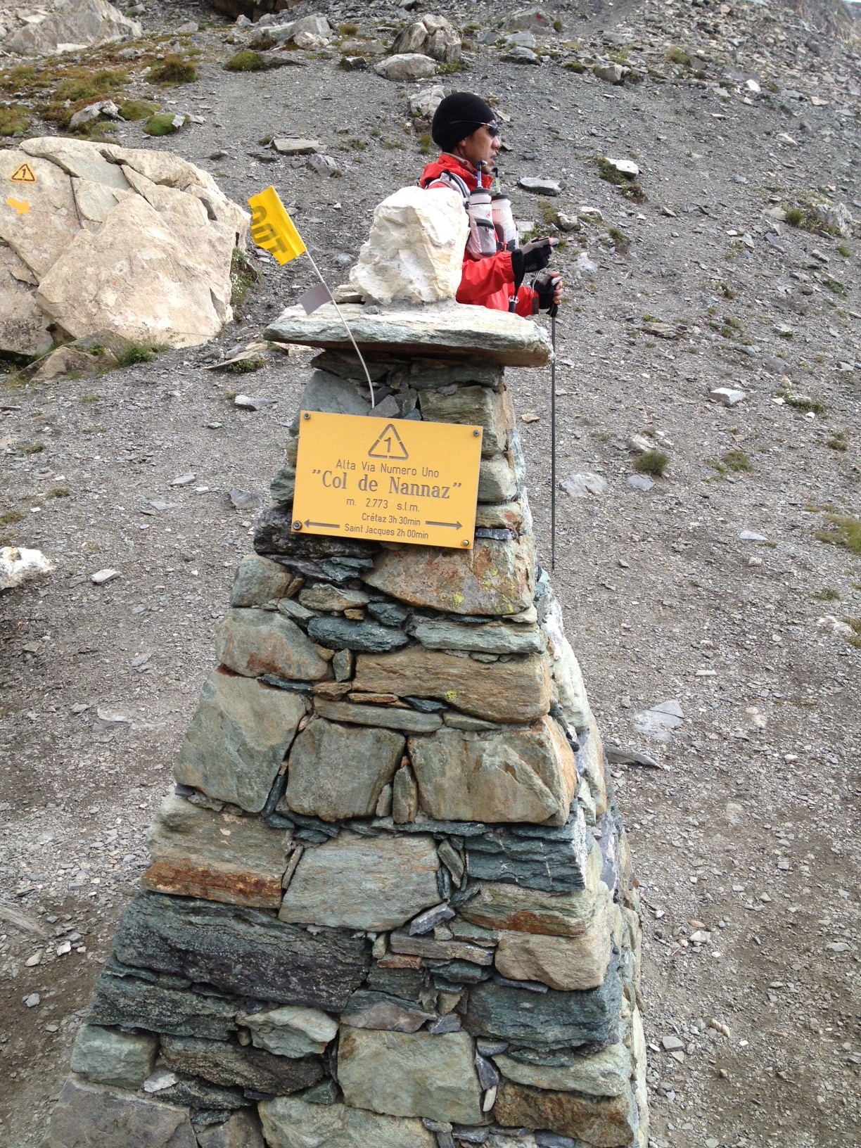 Donnasを出発してかなり険しい道が待ち受けていた。眠い中、平たい石の上をいくが暴風でコンタクトもストックも飛んじゃったらどうしよう~と思った。・・・でやっと着いた。ここは本当に天国だなと感じた。わんちゃんもほっとしてる。みんなで顔を合わせてほっとした場所でした。