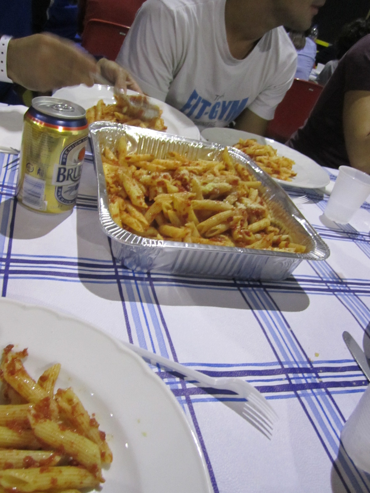 ↑ pasta partyにて。pastaってペンネなのね。 明日は天候が悪く雷が発生って….