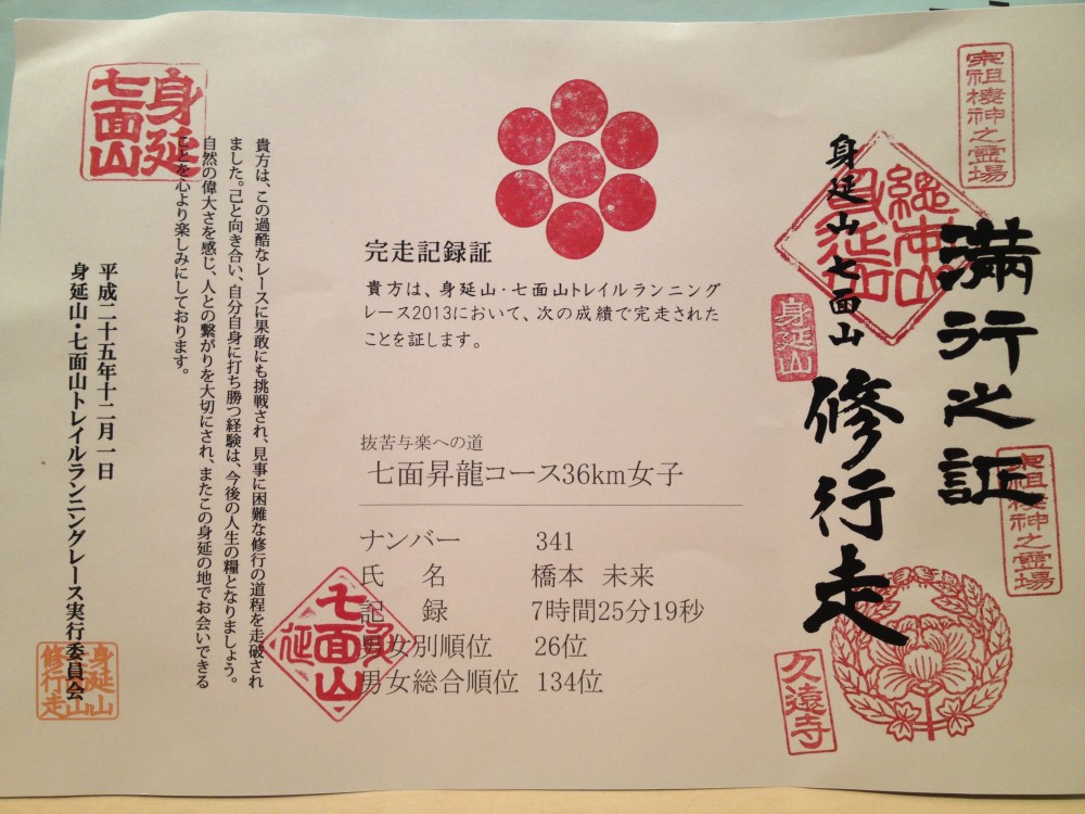 12月の上旬にいくつかのトレイルレースが全国で開催されますが、私は第一回のものに興味を持つので、今回は”身延山七面山修行走マウンテンランニング”に参加してきました。なんとアドバイザーは石川弘樹さん。弘樹さんはお会いしたことがないため、私のミーハー心に火がつき、クリック合戦に勝つことができました。(ハセツネのクリック合戦には負けたけど・・・)