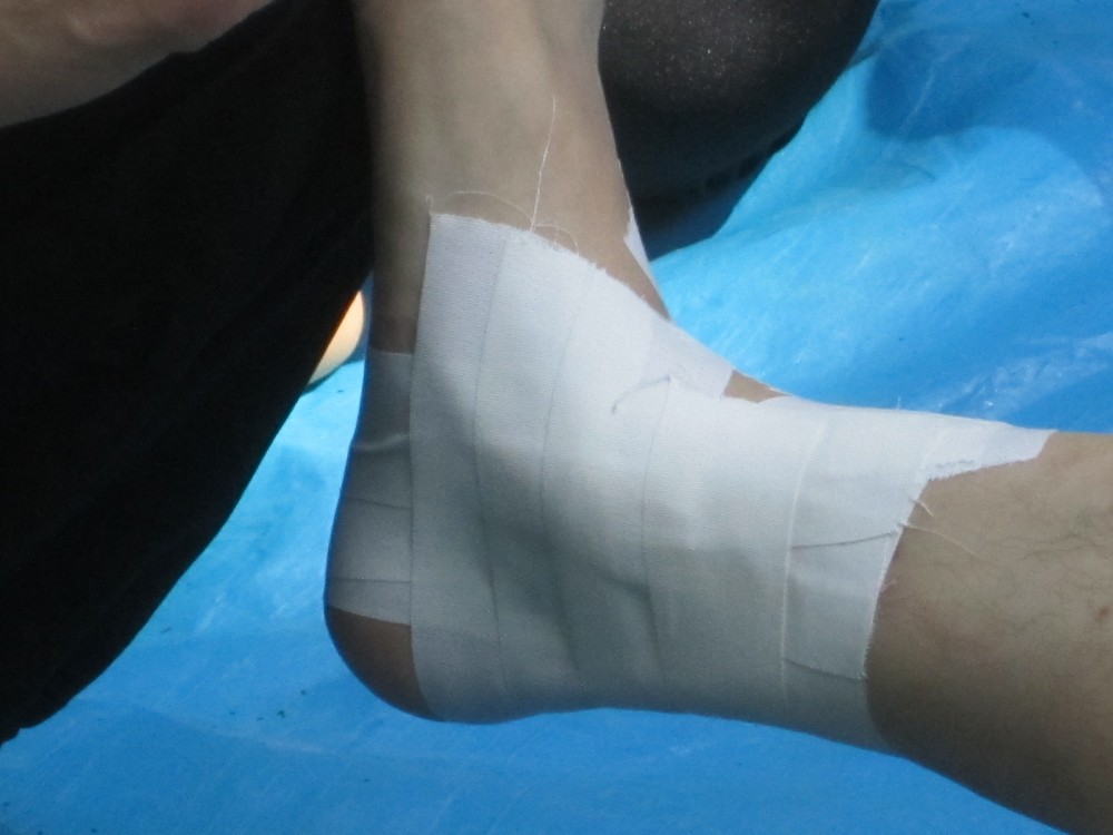 38mmの非伸縮テープを使用して、足首と膝のテーピングを学びました。