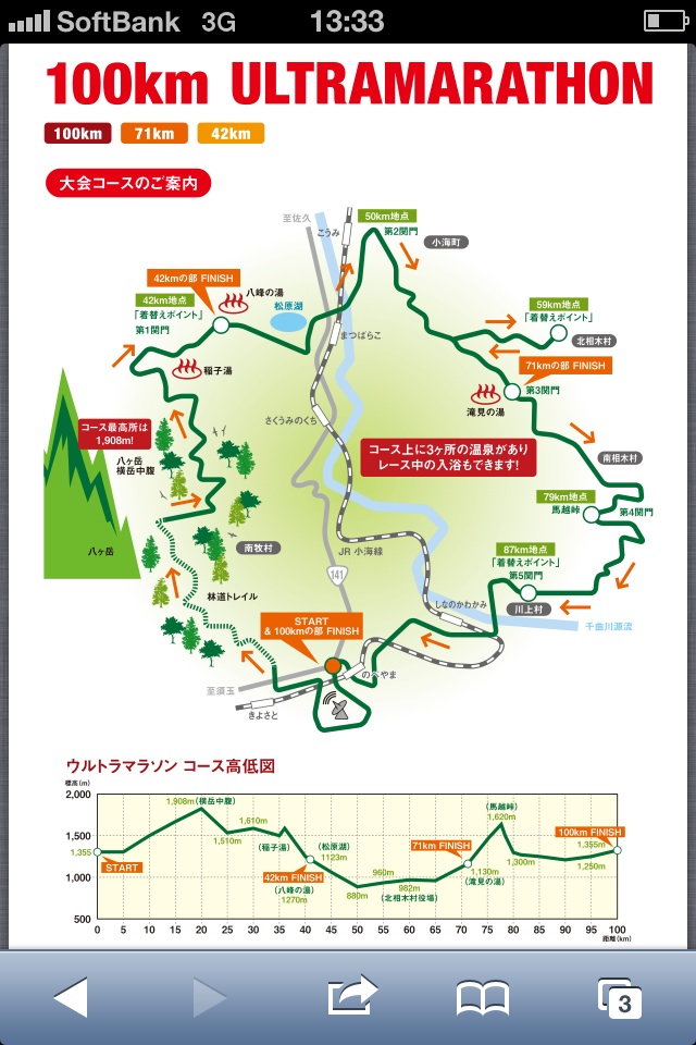 野辺山は1355mというちょっと標高の高めのところからスタートし、八ヶ岳が贅沢にも眺められ、コース上にある3か所の温泉に入ることができる、という大会でした。100kmの他に42kmと71kmもあります。そして2km,5km,10kmのショートマラソンも行われていました。