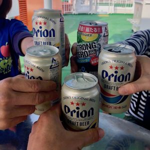 ↑空港からレンタカーで港へ。港の駐車場に車を預け、甲板にてとりあえず乾杯