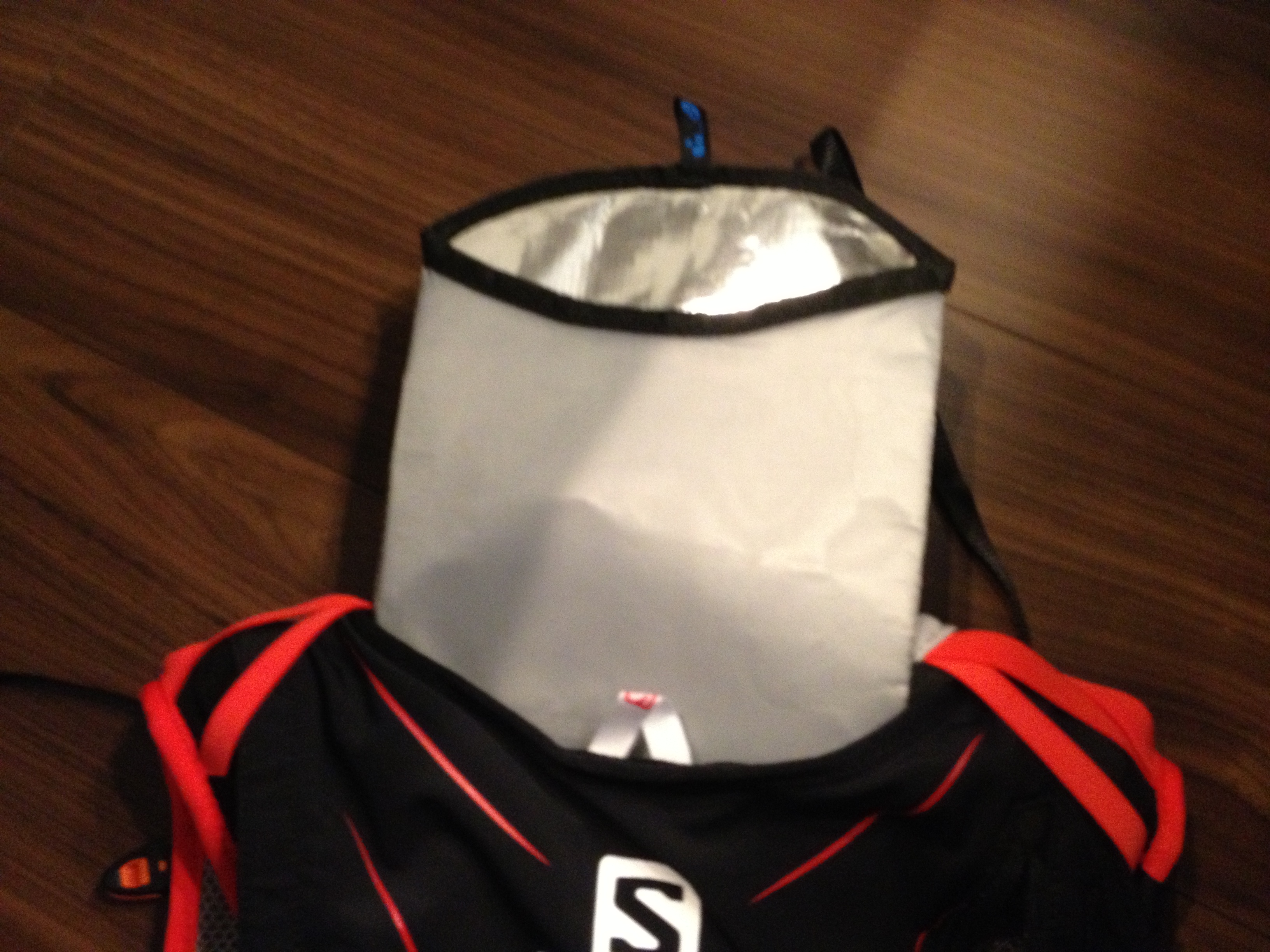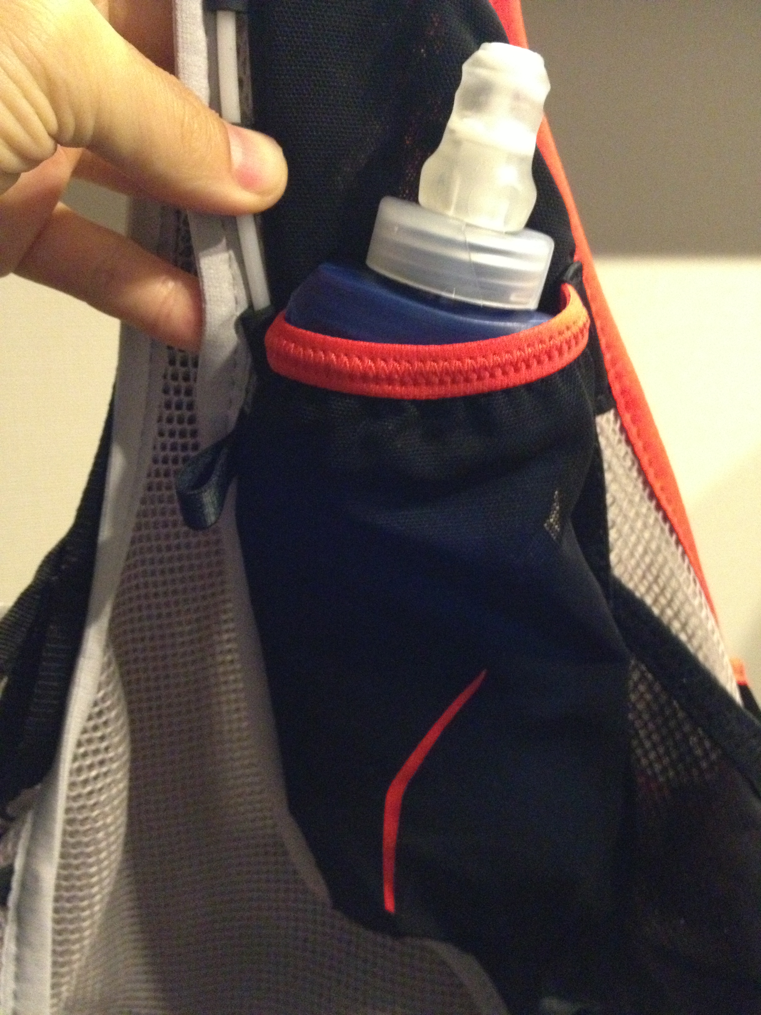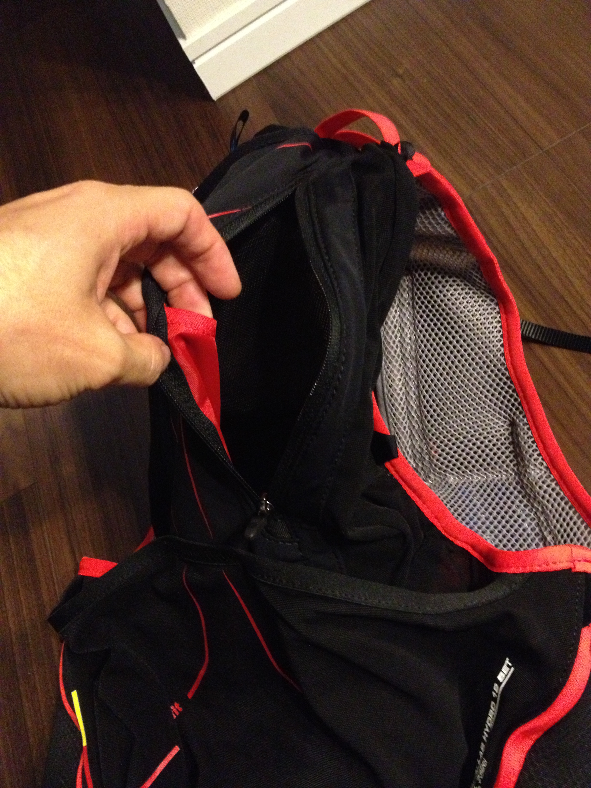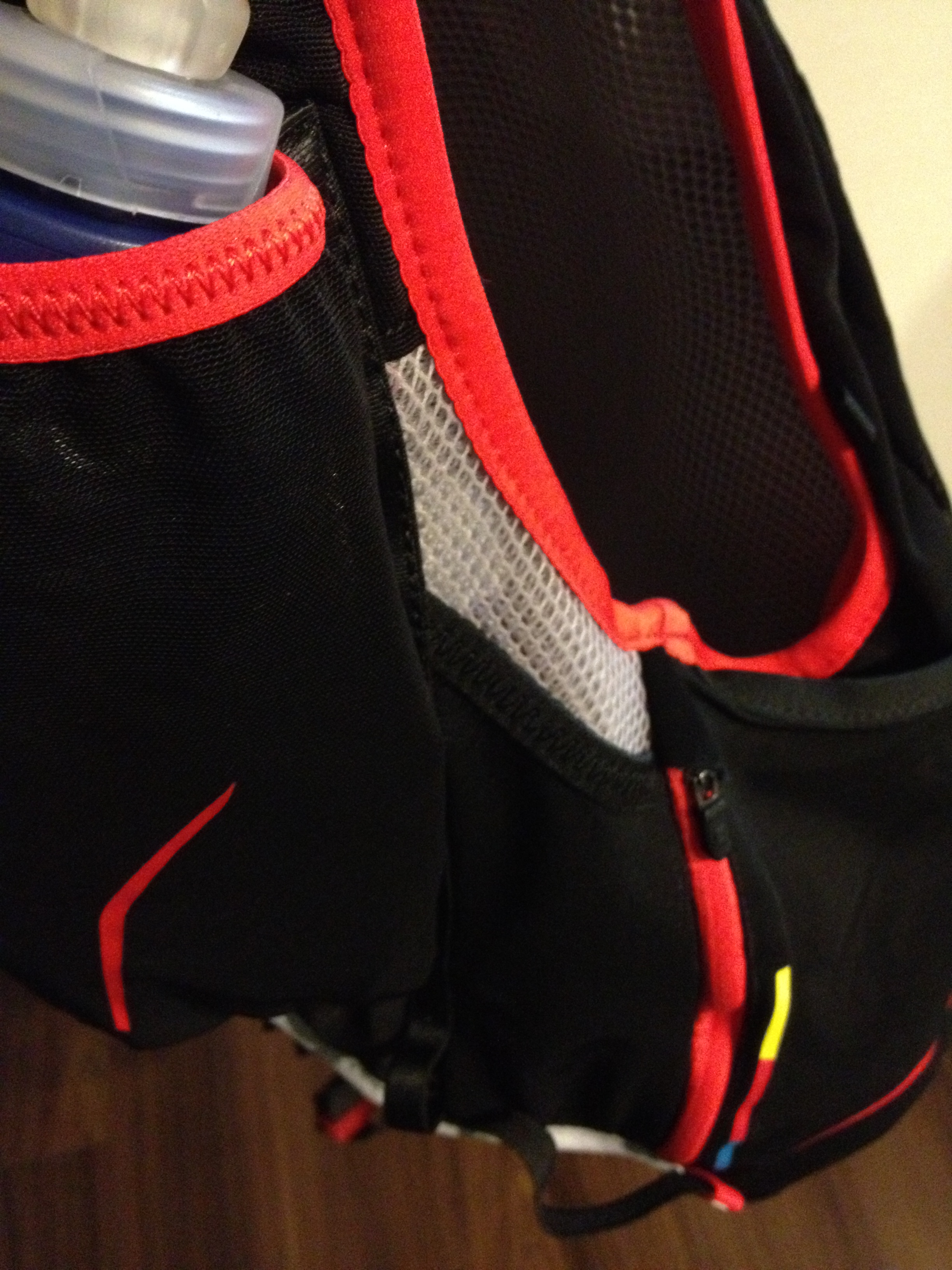 そして、一番前作と比べて素晴らしい点は、後ろの左右のポケットのチャックが縦方向に開閉するようになっている点。前作では、左右のポケットにアクセスするとき、体が硬いと開閉に少し難があったけど、これは開閉が簡単にできて良いです。また、フロントのボトルポケットもソフトフラスコ500mlがきちんと収まるように設計されているので、マジンガーZのアフロダイA状態から難なく脱却できますww