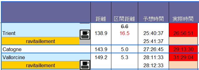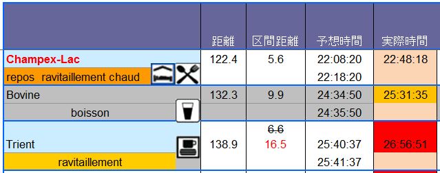 「あと、下って、登って、また下って、、、」とコースの説明をしてくれて、Bovineの方に登って行った。なんだか知り合いにあって少し元気がでて、痛いながらもなんとか頑張って下る。そして、Trientに到着。この時点で、目標から1時間16分遅れていた。