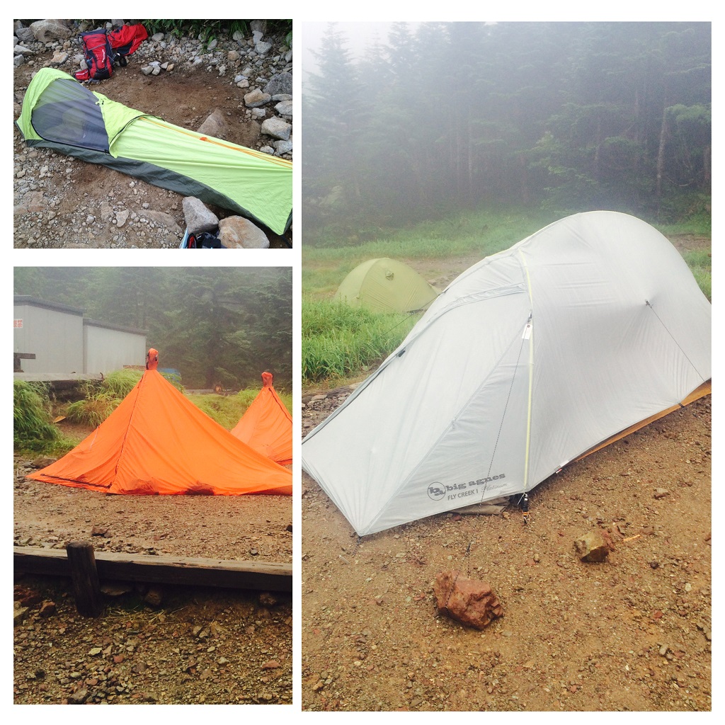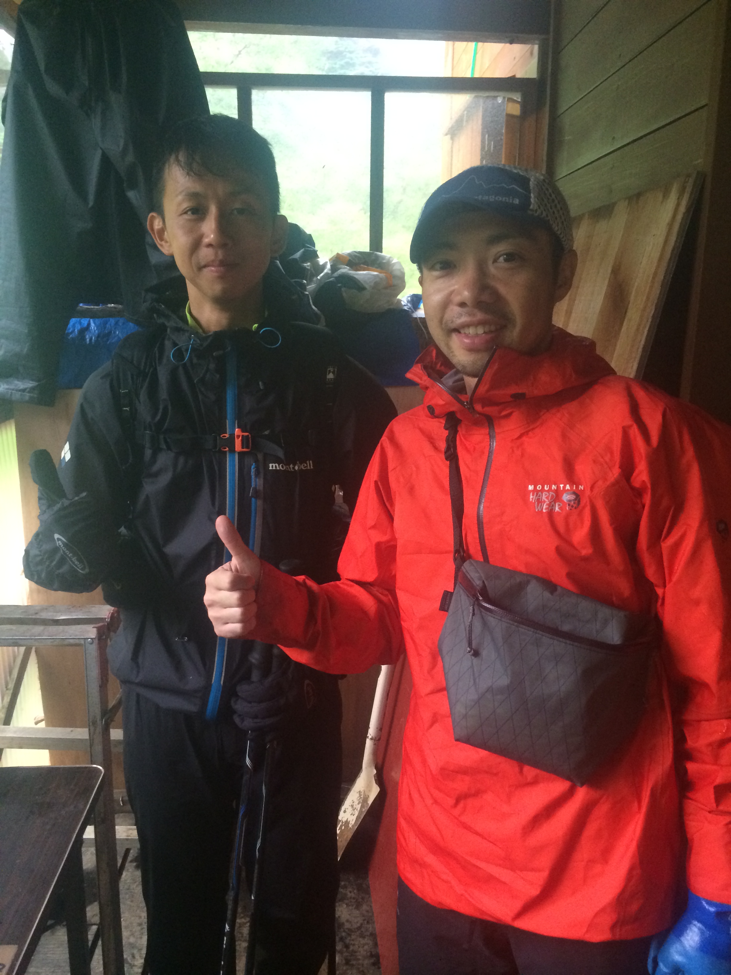 実はここ2年ほどテント設営中は天気に恵まれていたため、土砂降りの雨の中の設営というのは初。ザックは小屋に置いたまま、テントだけをもって傘を使いながら設営するという技も教えてもらい実践。とても貴重な経験となった。