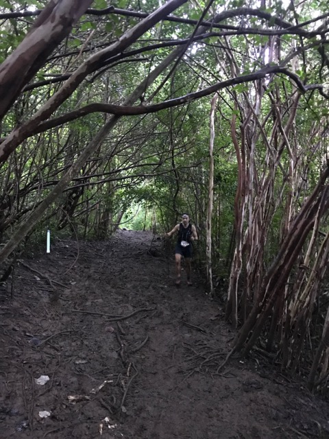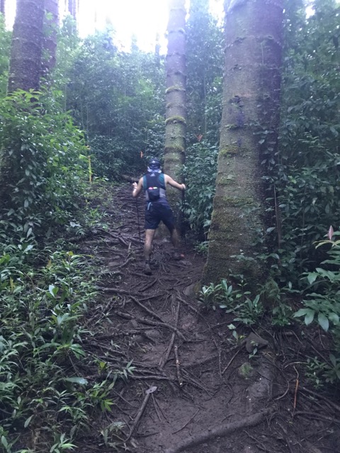 暗くなってきたのでヘッドライトをパラダイスで装着する。その後登り返して、Leg2のヌアヌへの下りも泥んこ祭り。