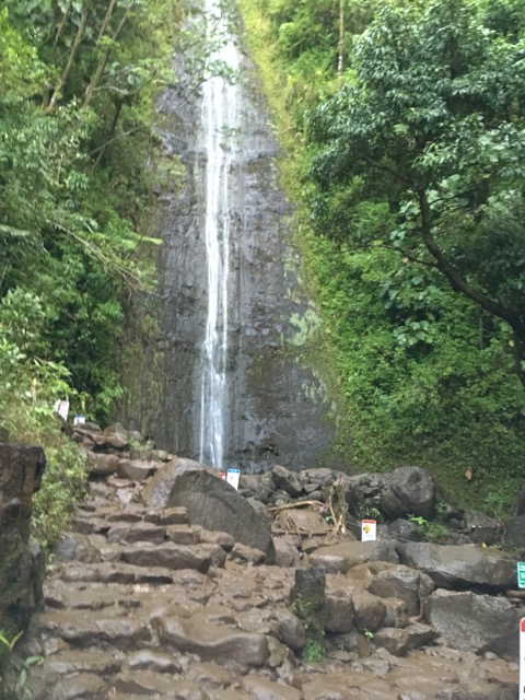 マノアの滝に降りていくところで、リョウ君のペーサーの方が登ってくる。でもリョウ君がいない。聞くと、膝の内側が急に痛くなり、脚が曲げられなくなったとか。