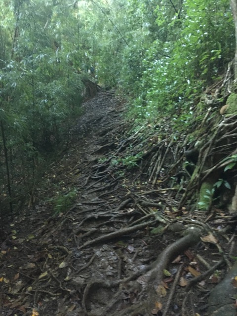 苦戦した下りは上りになるとそれほどでもない。直ぐに終わり、横移動を経てLeg2の下りへ。ここも案外テクニカル。岩が滑るし、雨も断続的に降っている。慎重に進みながら、川を渡渉し、ヌアヌエイドへ。