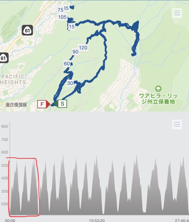 結局3周目は5h36minかかった。予定から約30分の超過。なかなか身体も疲れてきて、あと40mileあるのに結構ヤバイと正直感じていた。
