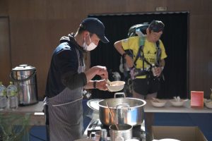 下り始めると風がなくなり日も出てきたので、ここで初めて短パン半袖になった。次のエイドはソーセージ、カレー、ポトフ、とあるのがスタート前から気になっていたので、頭はそればかりで走る。エイドに到着するとカレーは売り切れだけど、ポトフは在庫あり。地元の専門店が作るポトフだけあって、ソーセージもベーコンも本物が使われてるハイクオリティな味わいでびっくり。