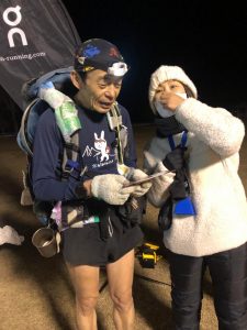 最後のエイド兼チェックポイントまでのコースはいきなり誘導員が少なくなった。しかも暗くて頼りになるのはスマホのGPSのみ。道路にレースの警備員さんがいたものの「どこがエイドか知らない」とキタ。よく見ると周りにエイドを探しているランナーが5-6人いた。
