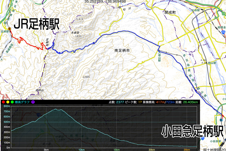 途中に足柄峠という標高700mオーバーの県境があるので徒歩で6時間近くかかる。