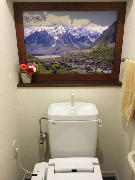 ウチのトイレは窓がない。困ることはなけど、入った瞬間1m先に壁が見えると閉塞感が甚だしい。山のトイレみたいに景色がいいと嬉しいな♥、ということで作ったのがこの窓。