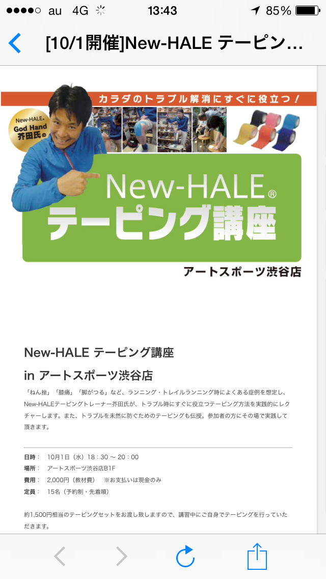 「ねん挫」「膝痛」「脚がつる」など、ランニング・トレイルランニング時によくある症例を想定し、New-HALEテーピングトレーナー芥田氏が、トラブル時にすぐに役立つテーピング方法を実践的にレクチャーします。また、トラブルを未然に防ぐためのテーピングも伝授。参加者の方にその場で実践して頂きます。