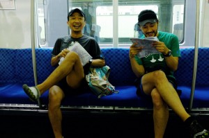 この頃になるとVibram Five Fingers 履いて走ってましたね。電車の移動中に次の目的等を決める作戦会議をしているところです、一応。ここでもご一緒させていただいてるのはRun boys! Run girls! プロデューサー桑原慶氏。
