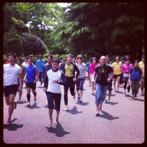 「BORN TO RUN」 の登場人物が目の前で走ってるってもう信じられないできごとなわけですよ。これは駒沢公園での裸足ランレクチャーの模様。この後ワンドロップカフェでトークショー。「BORN TO RUN」にサインをいただきました、足形入り!