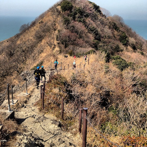幾つか登山口あるのですが、今回は海沿いからアプローチできる「灯台コース」から。とにかく登ってすぐに絶景が拝めるのでオススメです!結構な勾配なのですぐに汗が噴き出して昨日のアルコールが一気にデトックスされました。