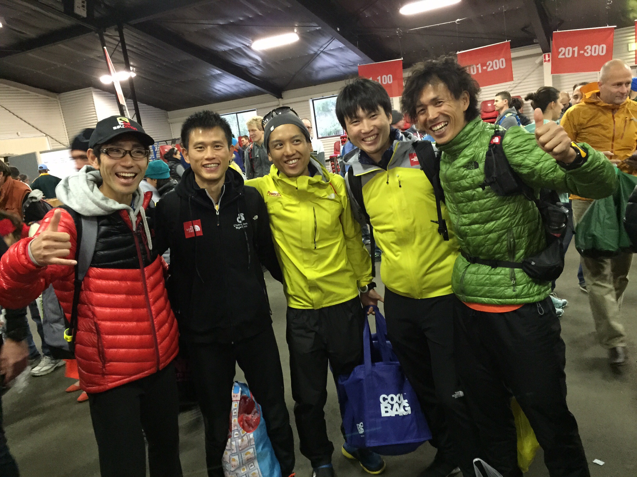 今大会は100マイル以上の必携品の多さがありまた内容も細く大変だった。一応なんとかgear checkは無事に終了して、これまた必携品のコースマップとビブを頂き、その後別のテントで参加Tも受け取り受け付けは終了となる。丁度その時に香港のストーン選手と会いお互いの健闘を誓い記念写真w