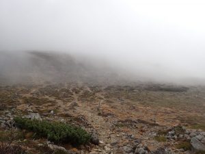 そこでは風も止んだので、「摩利支天(2959.2m)」までいけるかなっと「賽の河原」を通過して近くの避難小屋前に来ると突然雲と風が出て来たので、安全第一で折り返して下山へ。
