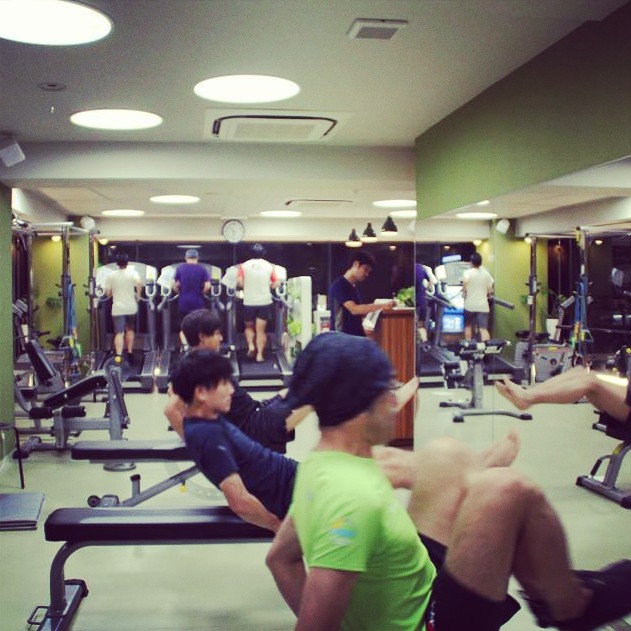 意識をしやすいように部位別に分けた腹筋を5種目やってからの傾斜をつけたトレッドミルという組み合わせを全部で5セット。