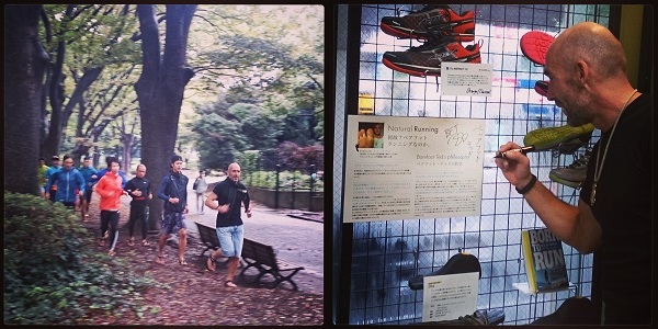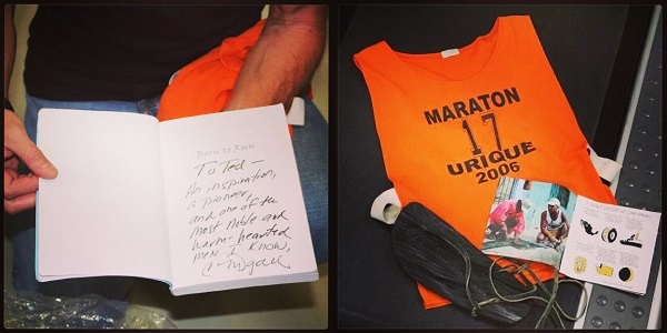 parkに戻ってからは、伝説のタラウマラ族のマニュエル・ルナが作ったルナサンダルの実物や、『BORN TO RUN』の山場でもある2006年のコッパーキャニオンのレース本番で使ったゼッケン、マクドゥガルからのメッセージ入りの『BORN TO RUN』の初版本などのお宝を披露。